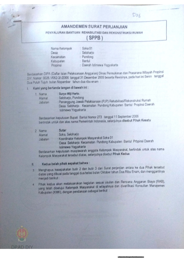Amandemen Surat Perjanjian Penyaluran Bantuan Rehabilitasi dan Rekonstruksi Rumah (SPPB), Nama Kelompok Soka 1 s.d. 17, Kel/Desa Seloharjo, Kecamatan Pundong, Kabupaten Bantul, Propinsi Daerah Istimewa Yogyakarta.