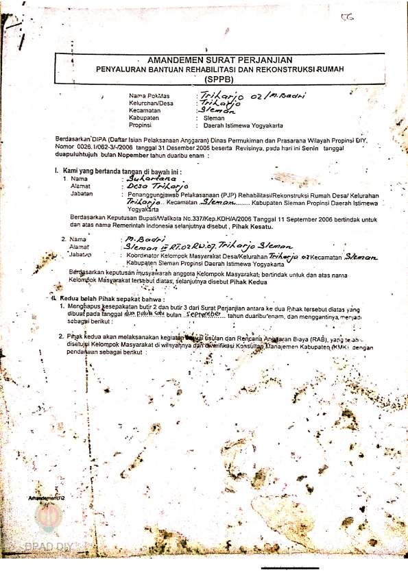 Amandemen Surat Perjanjian Penyaluran Bantuan Rehabilitasi dan Rekonstruksi Rumah (SPPB), Nama Kelompok Triharjo 001s.d. 005, Kel/Desa Triharjo, Kecamatan Sleman, Kabupaten Sleman, Propinsi Daerah Istimewa Yogyakarta.
