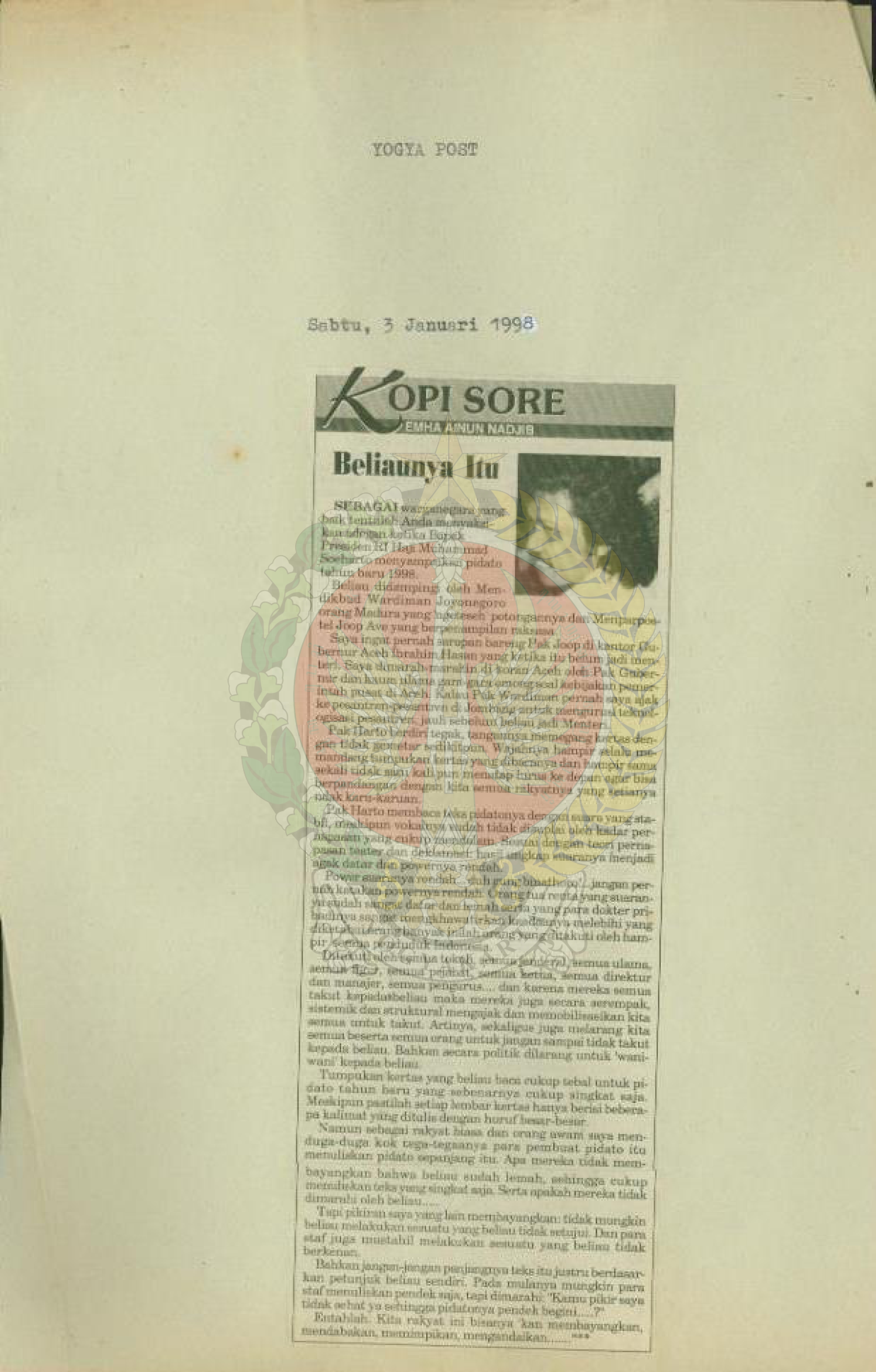 Item DPAD.ORBA.T26.F.1.33.1266 - Artikel dari Yogya Post tanggal 3 Januari 1998 perihal pendapat Emha Ainun Nadjib tentang Pidato Presiden Soeharto tahun 1998 dengan Judul Berita Kopi Sore Emha Ainun Nadjib.