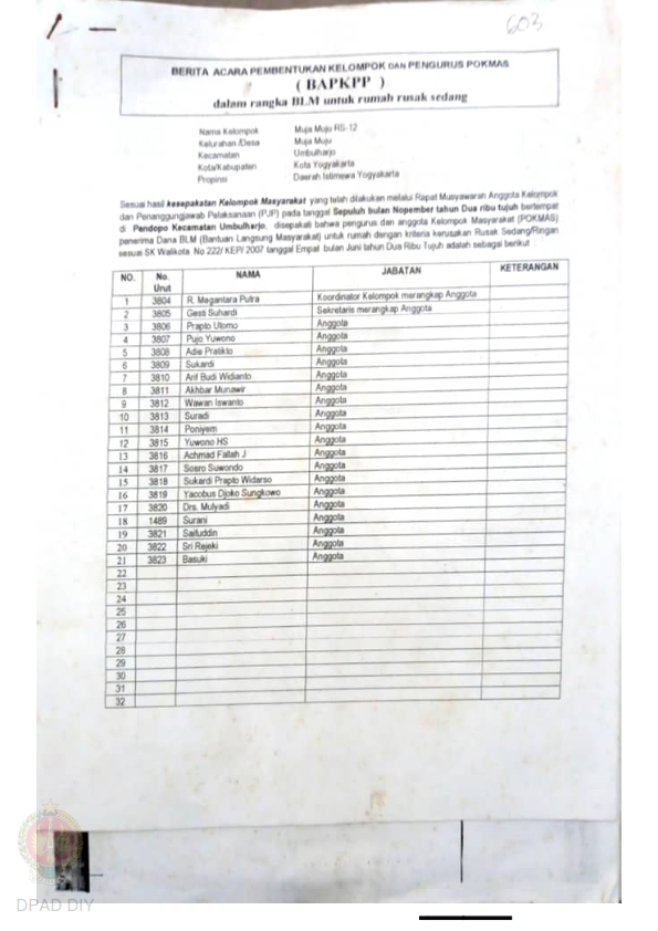 Berita Acara Pembentukan Kelompok dan Pengurus Pokmas (BAPKPP) dalam Rangka BLM untuk Rumah Rusak Sedang, Nama Kelompok Gunung Ketur RS I, Kelurahan Gunung Ketur, Kecamatan Pakualaman, Kota Yogyakarta, Propinsi Daerah Istimewa Yogyakarta. |