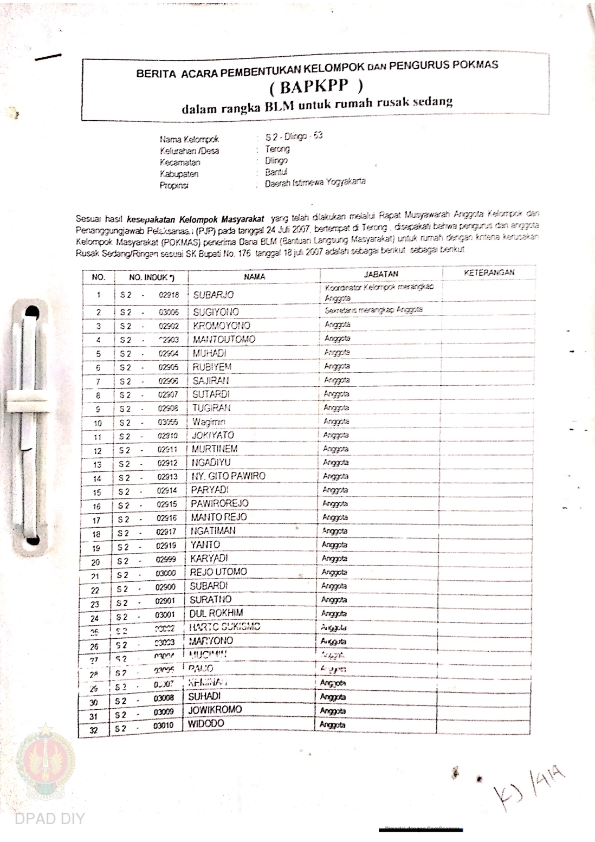 Berita Acara Pembentukan Kelompok dan Pengurus Pokmas (BAPKPP) dalam Rangka BLM untuk Rumah Rusak Sedang, Nama Kelompok S2 Dlingo 63 s.d. 67, Kelurahan Terong, Kecamatan Dlingo, Kabupaten Bantul, Propinsi Daerah Istimewa Yogyakarta.