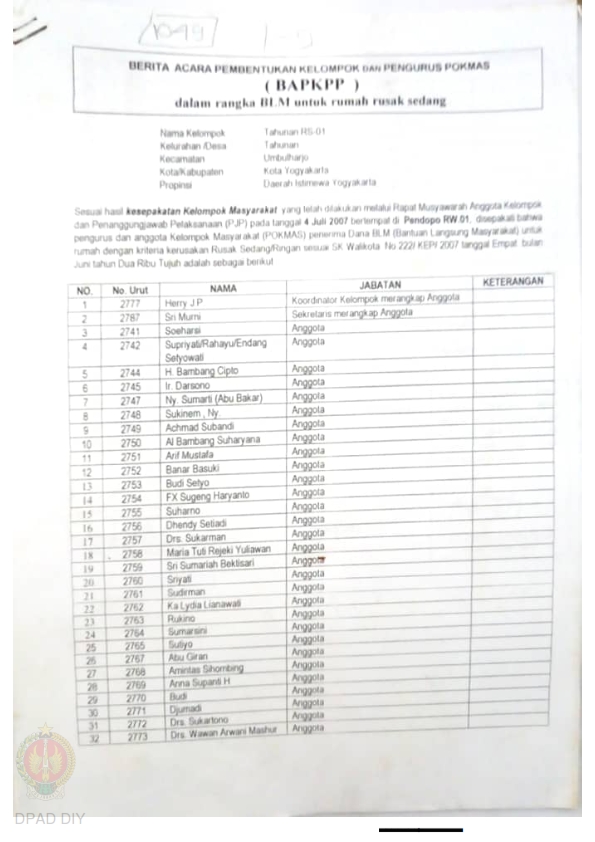 Berita Acara Pembentukan Kelompok dan Pengurus Pokmas (BAPKPP) dalam Rangka BLM untuk Rumah Rusak Sedang, Nama Kelompok Tahunan RS 1 s.d. 9, Kelurahan Tahunan, Kecamatan Umbulharjo, Kota Yogyakarta, Propinsi Daerah Istimewa Yogyakarta.