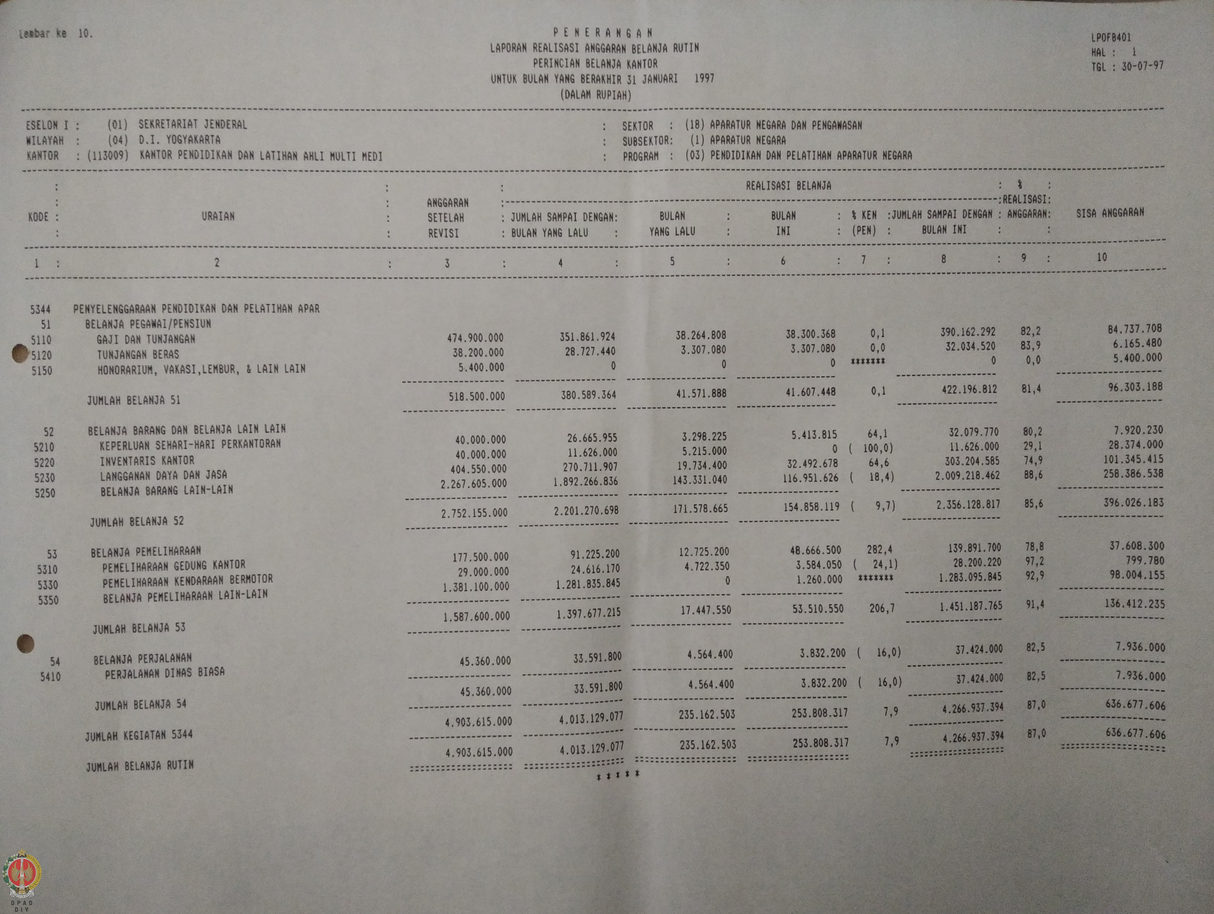 Berkas Laporan Realisasi Anggaran Belanja Rutin (Kantor), Daftar Transaksi Buku Besar dan Neraca Percobaan di Kantor Pendidikan dan Latihan Ahli Media Wilayah Daerah Istimewa Yogyakarta pada Bulan Januari - Maret 1997.