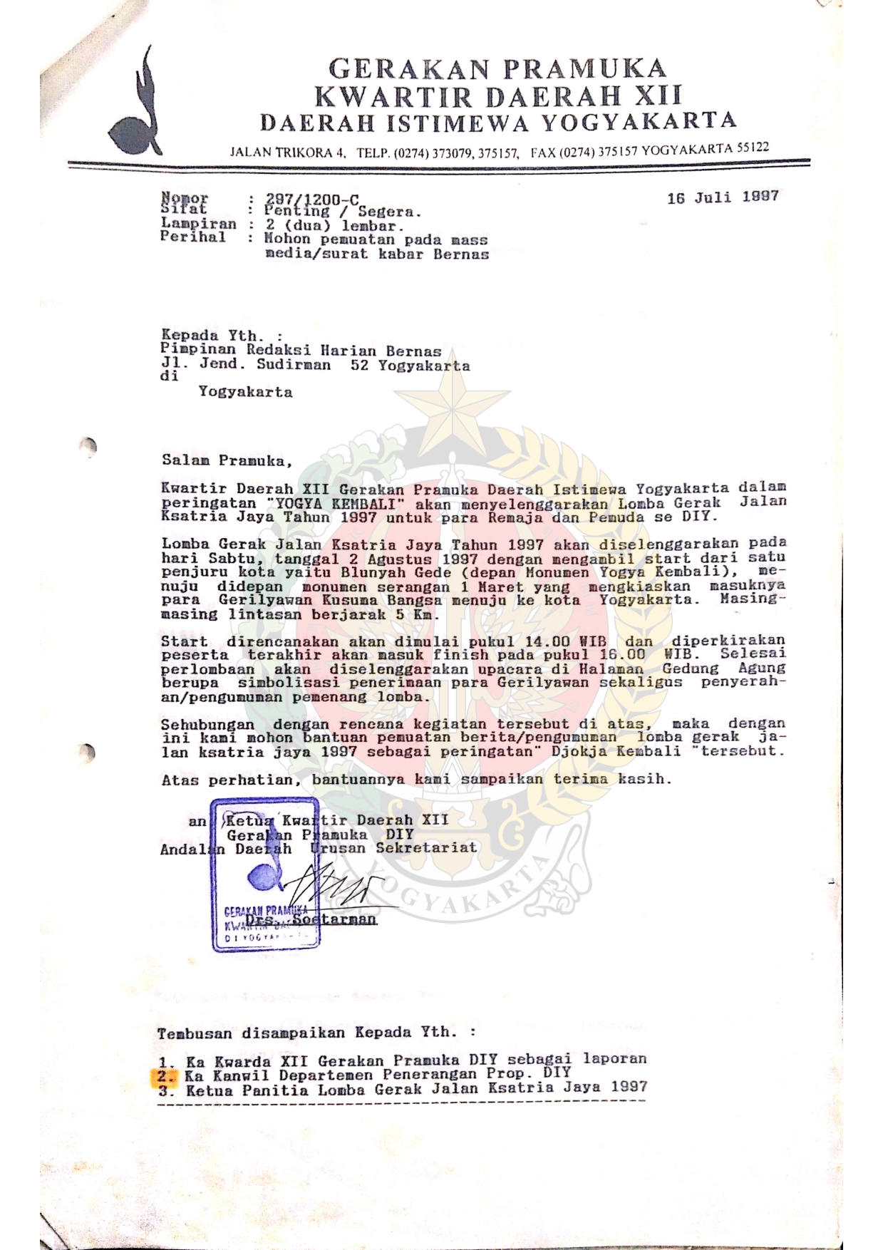 Berkas surat perihal mohon bantaun penyebaran iformasi/pemuatan pada massa media surat kabar atau stasiun tv mengenai Kegiatan Lomba Gerak jalan Kasatria Jaya dan Lomba Gerak Jalan Keluarga Sehat dalam rangka memperingati Hari Ibu ke-69.