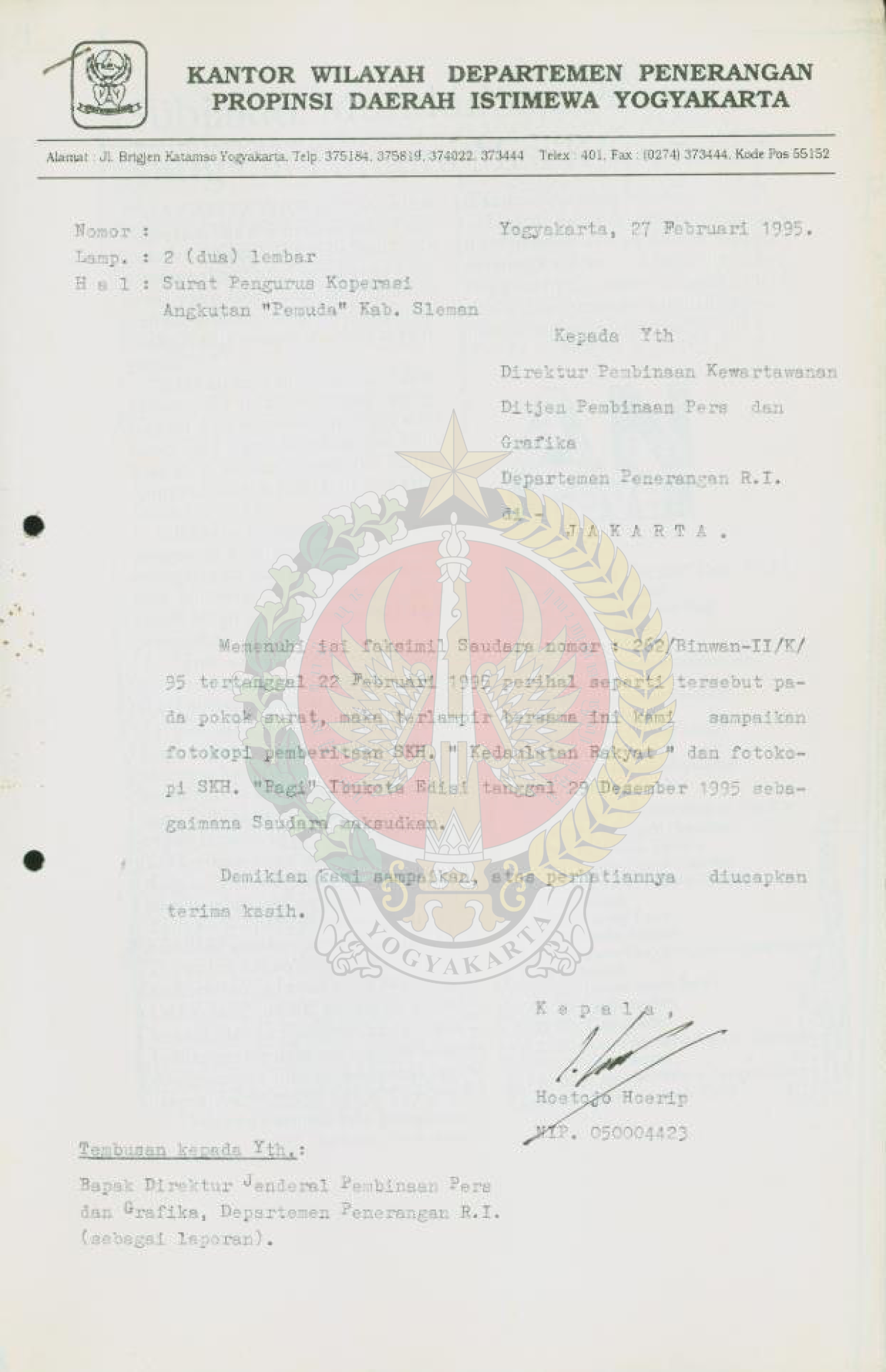 Berkas surat perihal Pemberitaan Surat Kabar Harian Kedaulatan Rakyat dan Surat Kabar Harian Pagi Ibu Kota edisi tanggal 29 Desember 1994 yang berjudul “SUBIAKTO, Mundur saja Pengurus Kopersai “PEMUDA” Sleman yang tidak pahami misi”.