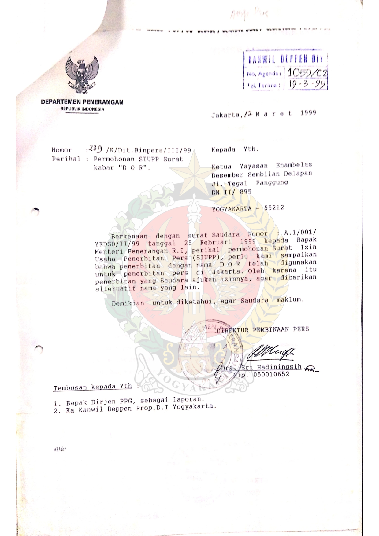 Berkas surat perihal permohonan Surat Izin Usaha Penerbitan Pers (SIUPP) dari Yayasan Enam Belas Desember Sembilan Delapan Yogyakarta untuk menerbitkan Surat Kabar Harian “DOR” (Dinamis, Obyektif, Realistis) beserta lampirannya.