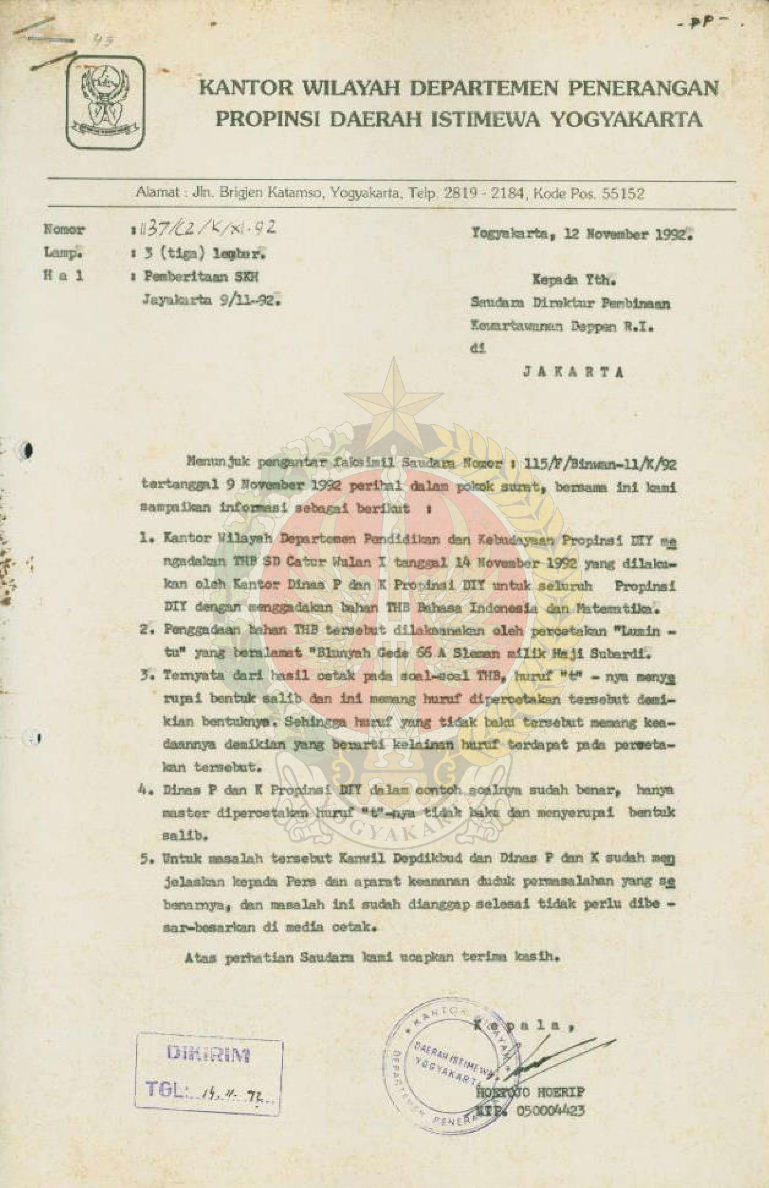 Berkas surat perihal sensitifitas/keberatan atas pemberitaan Surat Kabar Harian Jayakarta tanggal 9 November 1992 yang berjudul โHuruf Aneh di Yogyakartaโ beserta lampirannya.