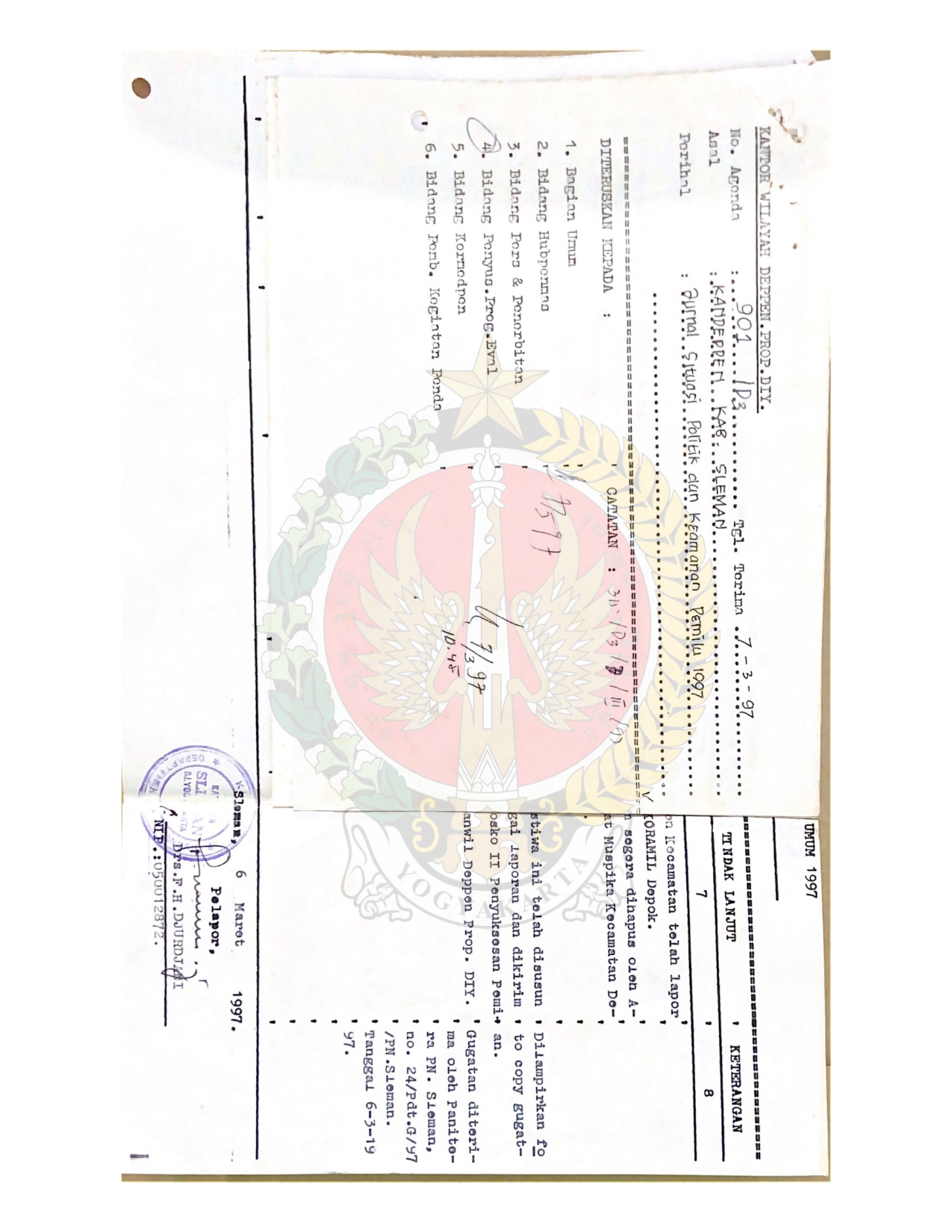 Surat dari Bagian Tata Usaha Kantor Departemen Penerangan Kabupaten Sleman kepada Posko II Penyuksesan dan Monitoring Pemilu 1997 Kantor Wilayah Departemen Penerangan Daerah Istimewa Yogyakarta perihal Jurnal Situasi Politik dan Keamanan Pemilihan Umum 1997