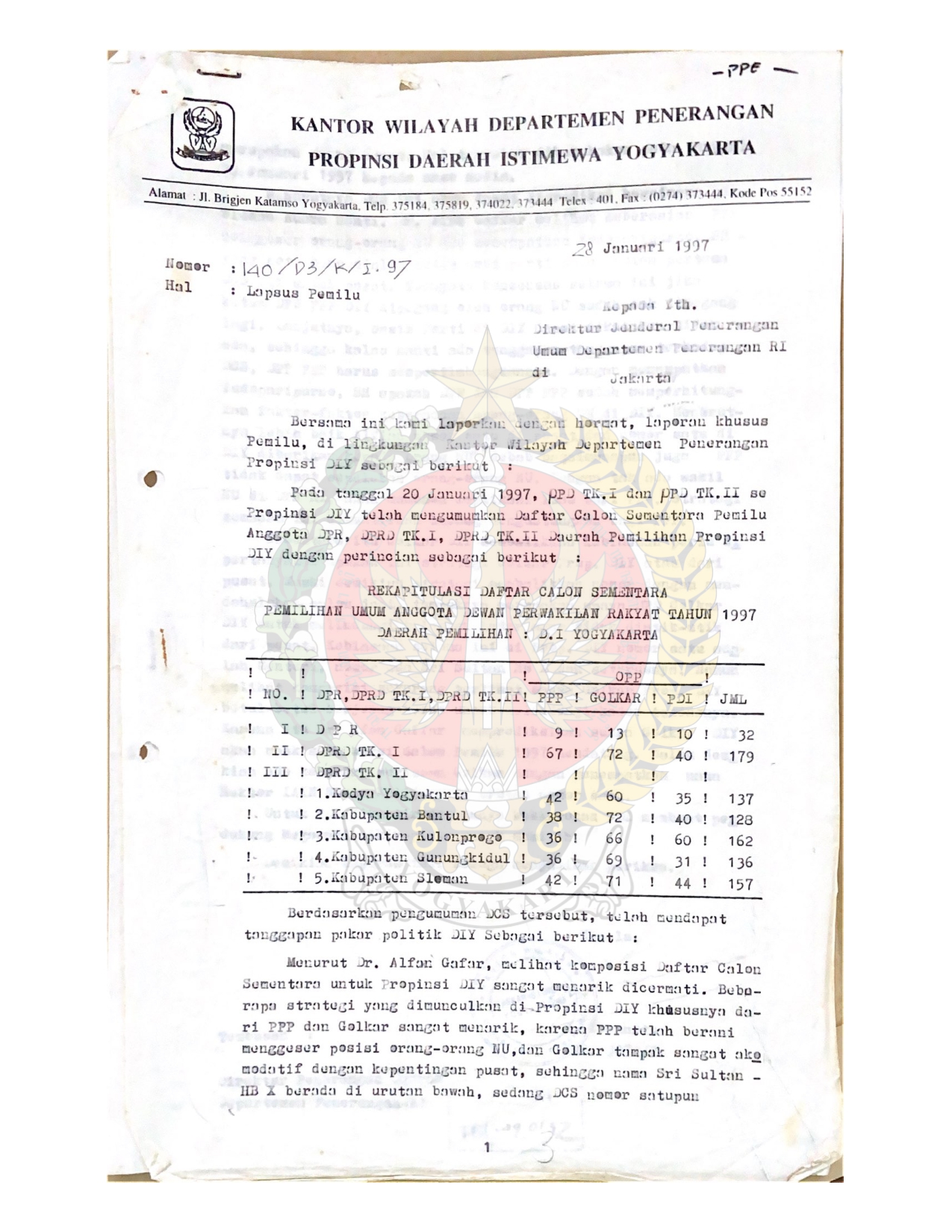 Berkas Surat dari Kepala Kantor Wilayah Departemen Penerangan Daerah Istimewa Yogyakarta kepada Direktur Jenderal Penerangan Umum Departemen Penerangan Republik Indonesia perihal laporan situasi dan kondisi menjelang pelaksanaan Pemilu 1997 di Provinsi Daerah Istimewa Yogyakarta