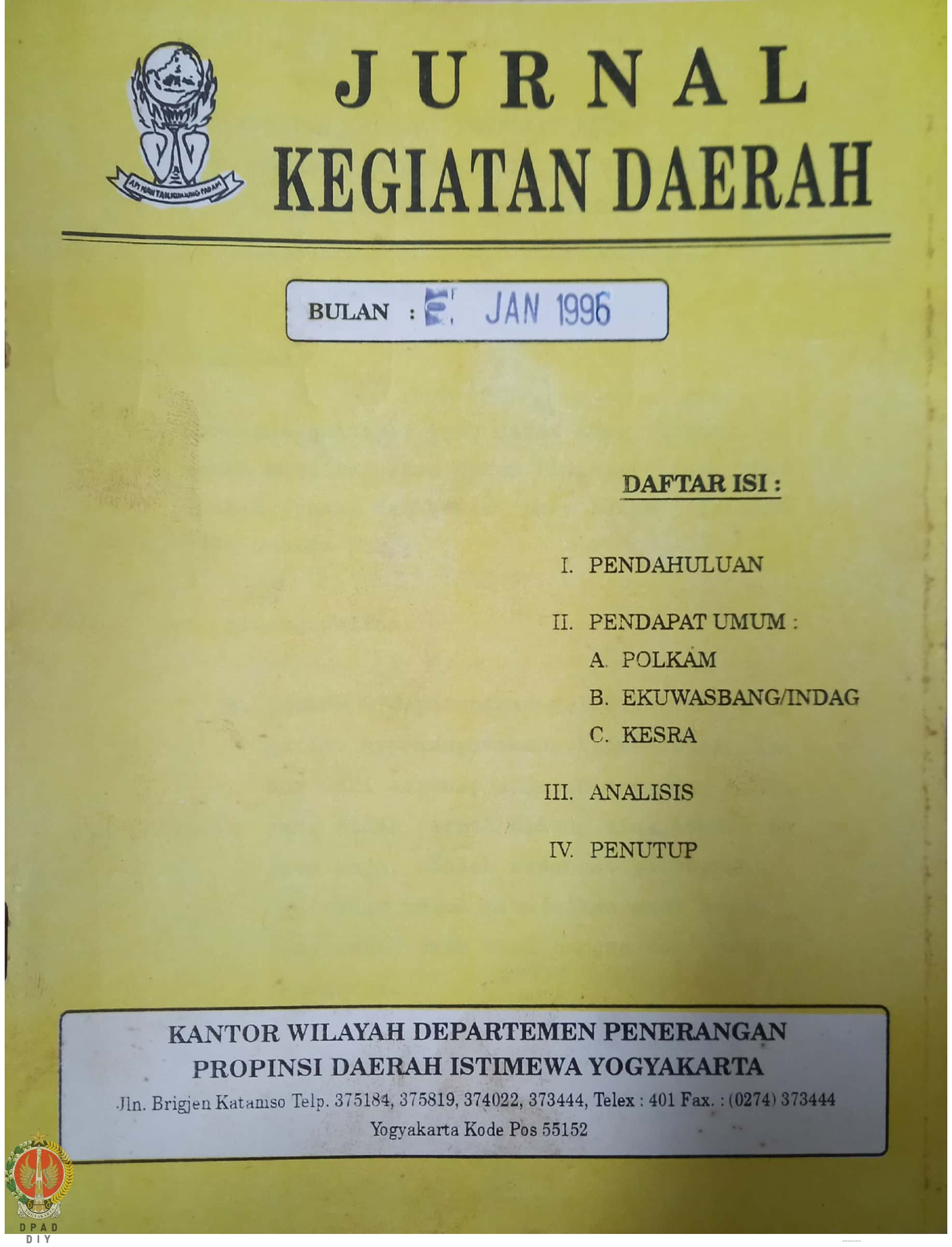 Jurnal Kegiatan Daerah Analisa Situasi Pendapatan Umum Bidang IPOLKAM (Ideologi Politik dan Keamanan), EKUIN (Ekonomi, Keuangan dan Industri), dan Kesra (Kesejahteraan Rakyat) Wilayah Provinsi Daerah Istimewa Yogyakarta Bulan April-Desember 1992, Kantor Wilayah Departemen Penerangan Daerah Istimewa Yogyakarta.