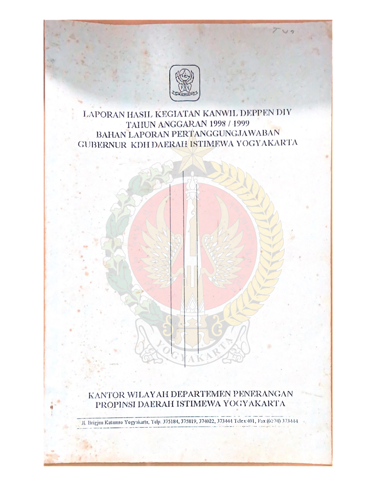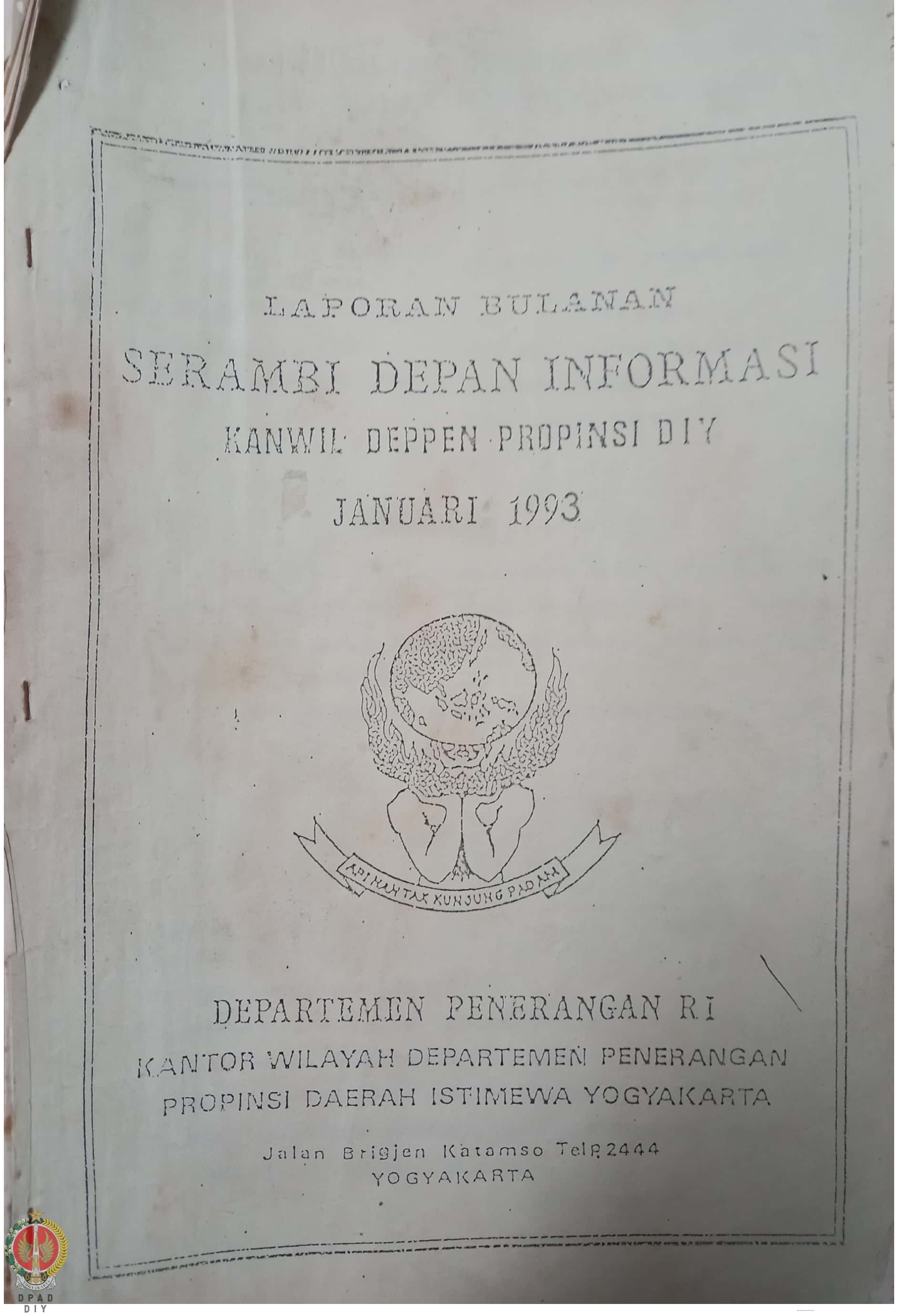 Laporan Bulanan Serambi Depan Informasi Kantor Wilayah Departemen Penerangan Provinsi Daerah Istimewa Yogyakarta bulan Januari, Maret, April, Juni, Juli, Agustus, September, Oktober, November tahun 1993 Departemen Penerangan Republik Indonesia Kantor Wilayah Departemen Penerangan Daerah Istimewa Yogyakarta |