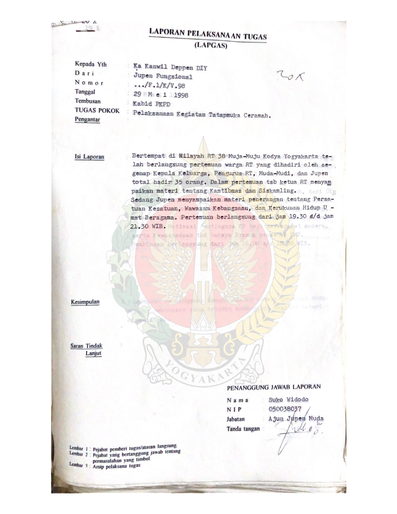 Laporan Pelaksanaan Tugas (LapGas) kepada Kepala Kantor Wilayah Departemen Penerangan Provinsi Daerah Istimewa Yogyakarta dari pegawai-pegawai Departemen dalam menjalankan tugas-tugas pokoknya.