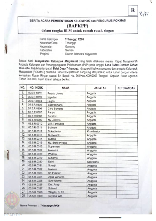 Checklist Kelengkapan Dokumen untuk Pencairan Dana Rehabilitasi dan Rekonstruksi Rumah Rusak Ringan Nama Kelompok Ambarketawang 007, 012 s.d. 014, 017, Kel/Desa Ambarketawang, Kecamatan Gamping, Kabupaten Sleman, Propinsi Daerah Istimewa Yogyakarta.