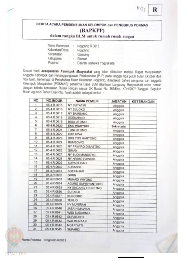 Checklist Kelengkapan Dokumen untuk Pencairan Dana Rehabilitasi dan Rekonstruksi Rumah Rusak Ringan Nama Kelompok Trihango R 003, 006, 016, 026, Kel/Desa Trihanggo, Kecamatan Gamping, Kabupaten Sleman, Propinsi Daerah Istimewa Yogyakarta.