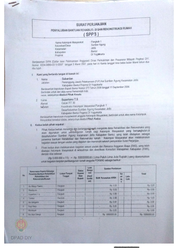 Surat Perjanjian Penyaluran Bantuan Rehabilitasi dan Rekonstruksi Rumah (SPPB), Nama Kelompok Pangkah 1 s.d. 18, Kel/Desa Sumber Agung, Kecamatan Jetis, Kabupaten Bantul, Propinsi Daerah Istimewa Yogyakarta.