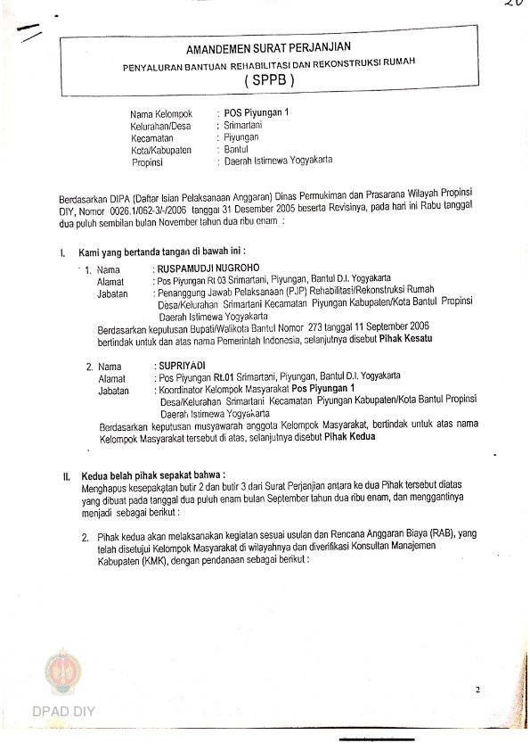 Amandemen Surat Perjanjian Penyaluran Bantuan Rehabilitasi dan Rekonstruksi Rumah (SPPB), Nama Kelompok Masyarakat Banyakan II, Kel/Desa Sitimulyo, Kecamatan Piyungan, Kabupaten Bantul, Provinsi Daerah Istimewa Yogyakarta.