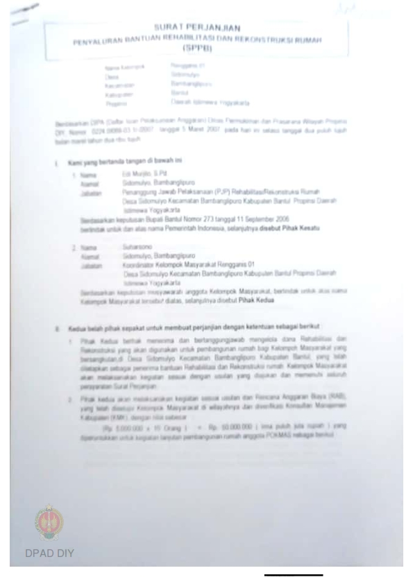 Surat Perjanjian Penyaluran Bantuan Rehabilitasi dan Rekonstruksi Rumah (SPPB), Nama Kelompok Masyarakat Mandangan 1 s.d 14, Kel/Desa Srimartani, Kecamatan Piyungan, Kabupaten Bantul, Provinsi Daerah Istimewa Yogyakarta.
