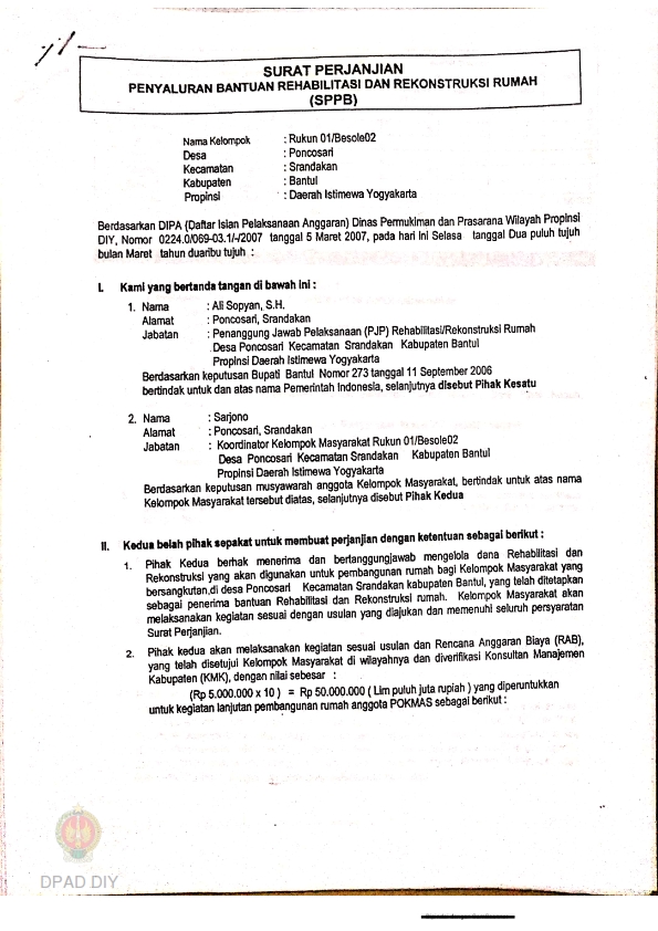 Surat Perjanjian Penyaluran Bantuan Rehabilitasi dan Rekonstruksi Rumah (SPPB), Nama Kelompok Masyarakat Karang I dan II, Kel/Desa Poncosari, Kecamatan Srandakan, Kabupaten Bantul, Propinsi Daerah Istimewa Yogyakarta.