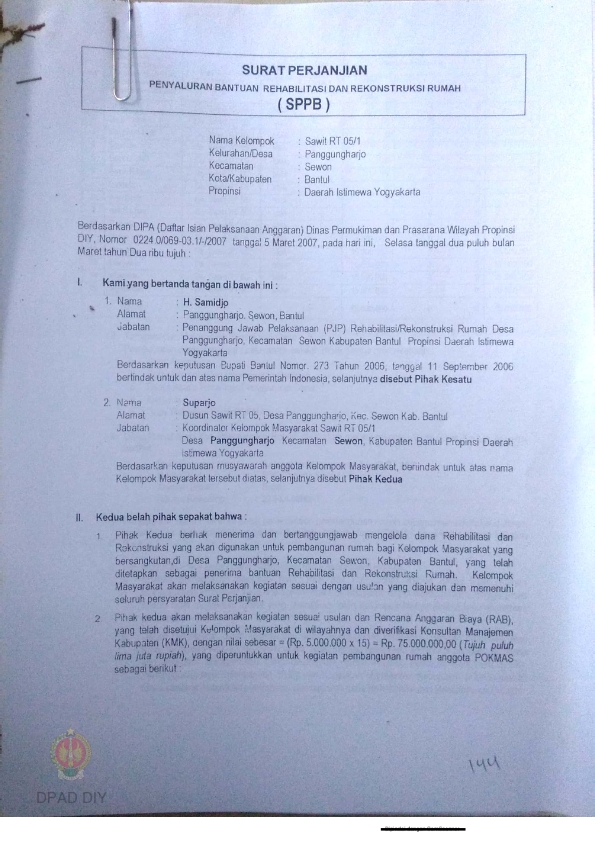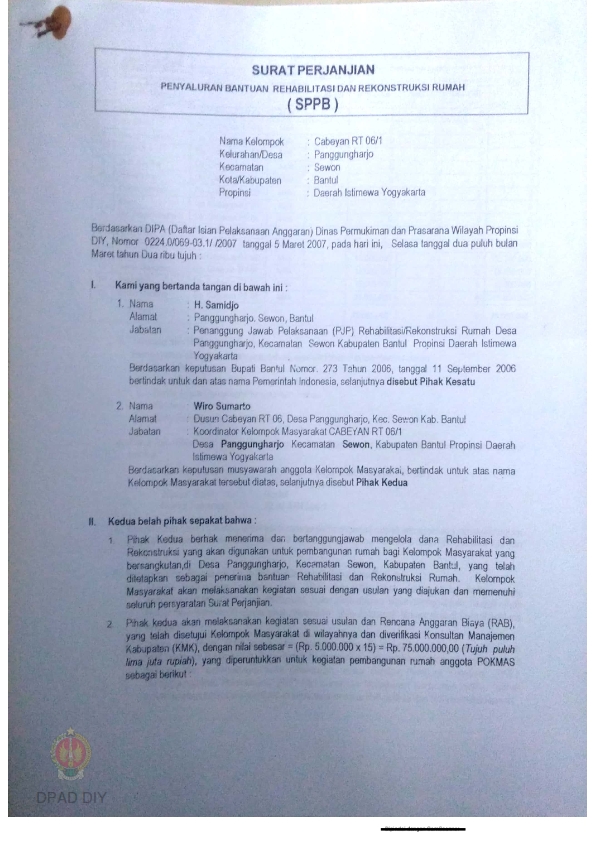 Surat Perjanjian Penyaluran Bantuan Rehabilitasi dan Rekonstruksi Rumah (SPPB), Nama Kelompok Masyarakat Wanujoyo Lor, Kel/Desa Srimartani, Kecamatan Piyungan, Kabupaten Bantul, Provinsi Daerah Istimewa Yogyakarta.