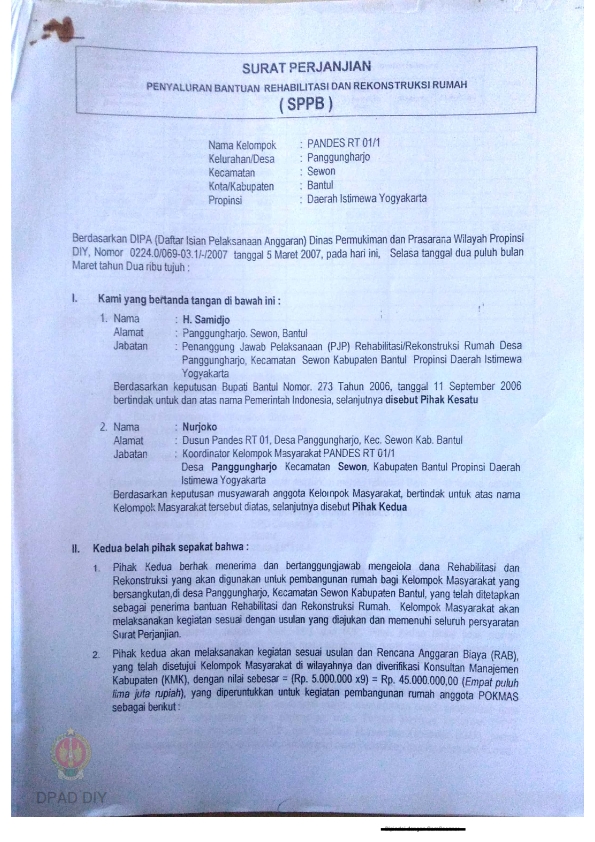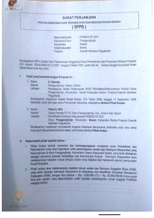 Surat Perjanjian Penyaluran Bantuan Rehabilitasi dan Rekonstruksi Rumah (SPPB), Nama Kelompok Pandes RT 02 / 1 s.d 2, Kel/Desa Panggungharjo, Kecamatan Sewon, Kabupaten Bantul, Propinsi Daerah Istimewa Yogyakarta.