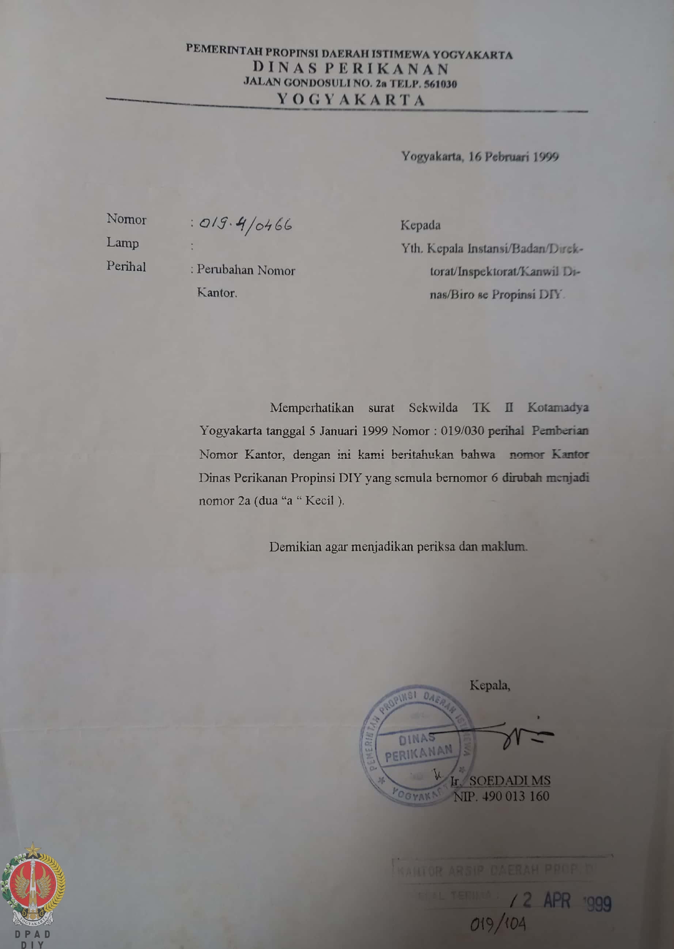 Surat dari Kepala Dinas Perikanan kepada Kepala Instansi / Badan / Direktorat / Inspektorat / Kantor Wilayah / Dinas / Biro se Provinsi Daerah Istimewa Yogyakarta perihal perubahan Nomor Kantor Dinas Perikanan Provinsi Daerah Istimewa Yogyakarta yang semula bernomor 6 dirubah menjadi nomor 2a (dua “a” kecil).