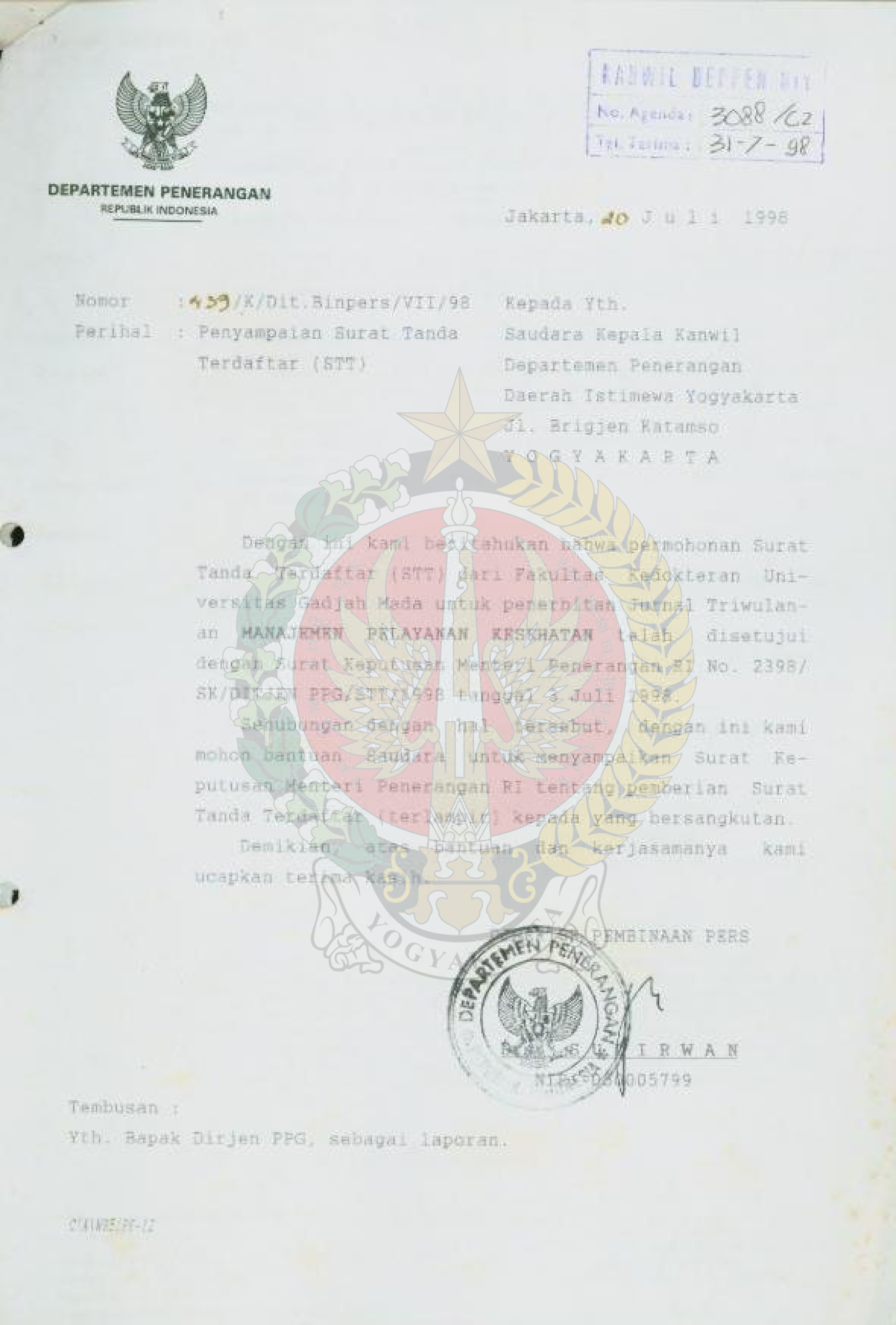 Berkas Surat Keputusa Menteri Penerangan Republik Indonesia Nomor : 2398/SK/ DITJEN PPG/STT/1998 tentang pemberian Surat Tanda Terdaftar (STT) bagi penerbitan khusus kepada Fakultas Kedokteran Universitas Gadjah Mada untuk menerbitkan jurnal Triwulan โManajemen Pelayanan Kesehatanโ beserta lampirannya