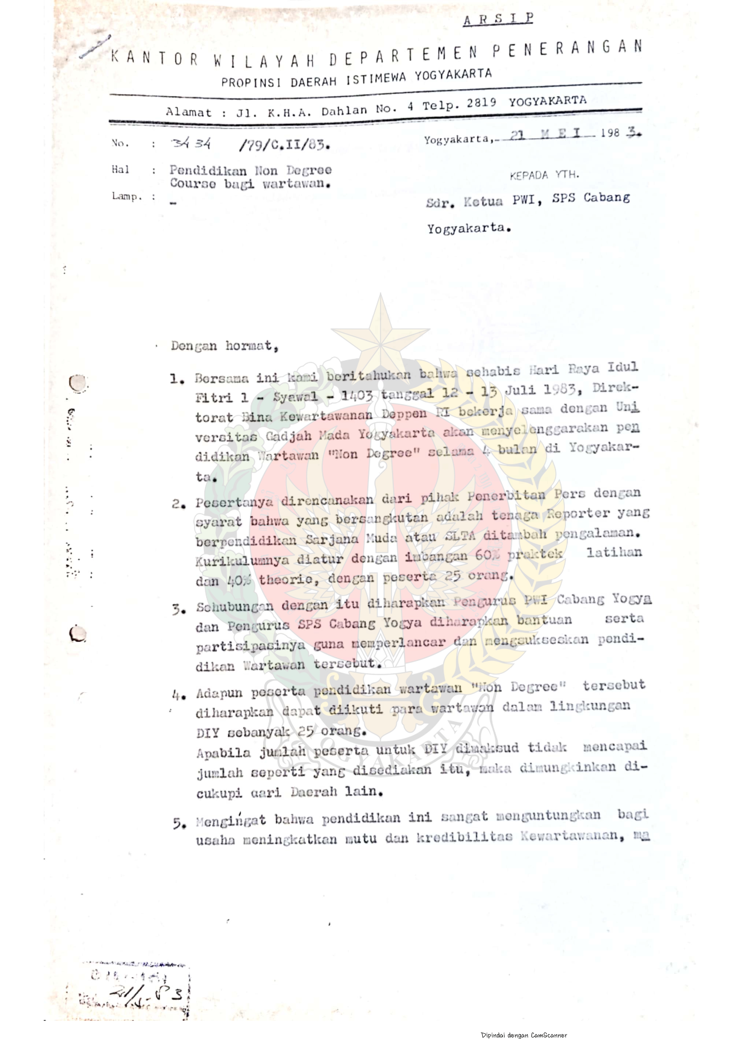 Berkas dari Kantor Wilayah Departemen Penerangan kepada Ketua Persatuan Wartawan Indonesia perihal Pendidikan Non Degree Course bagi wartawan.