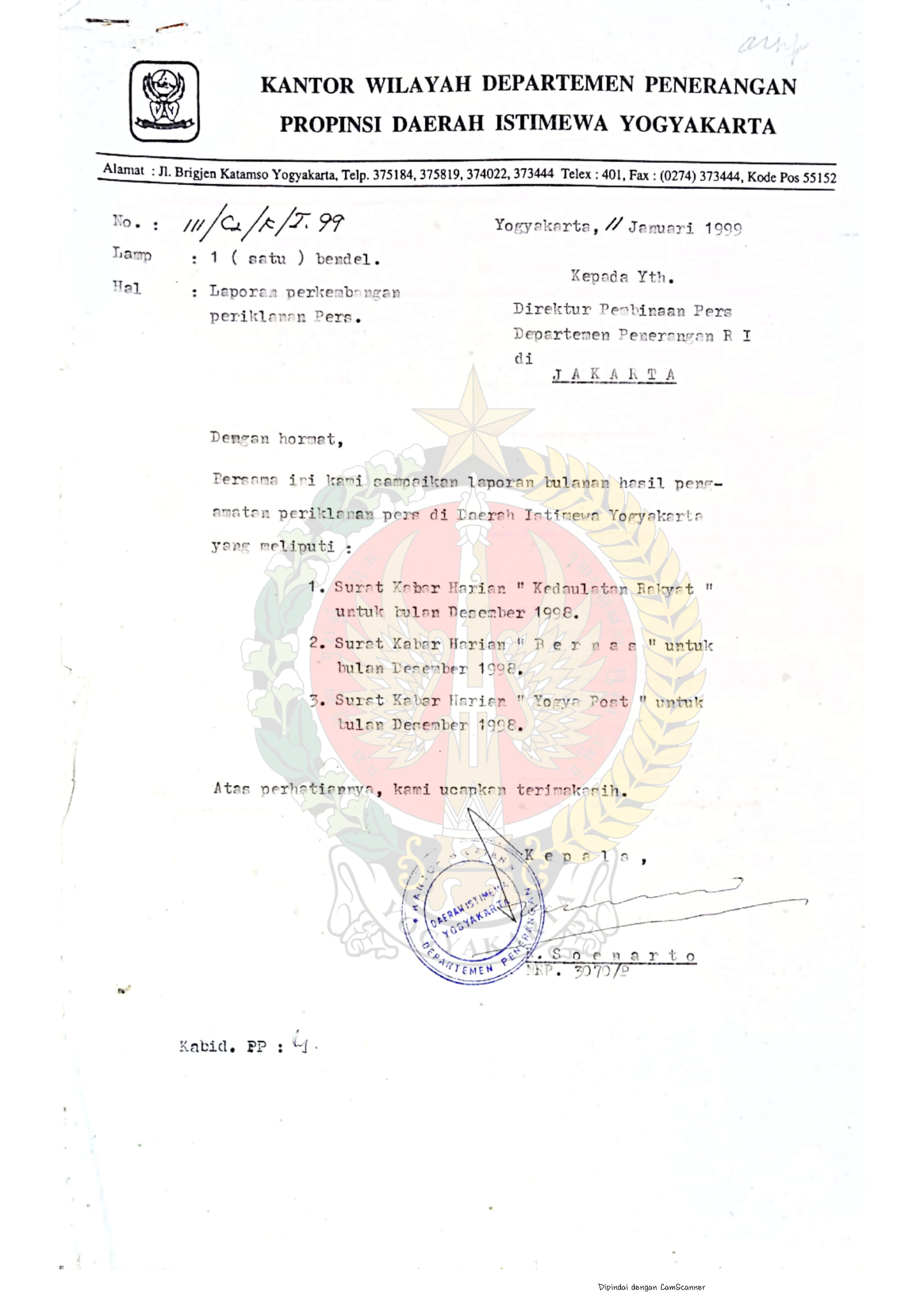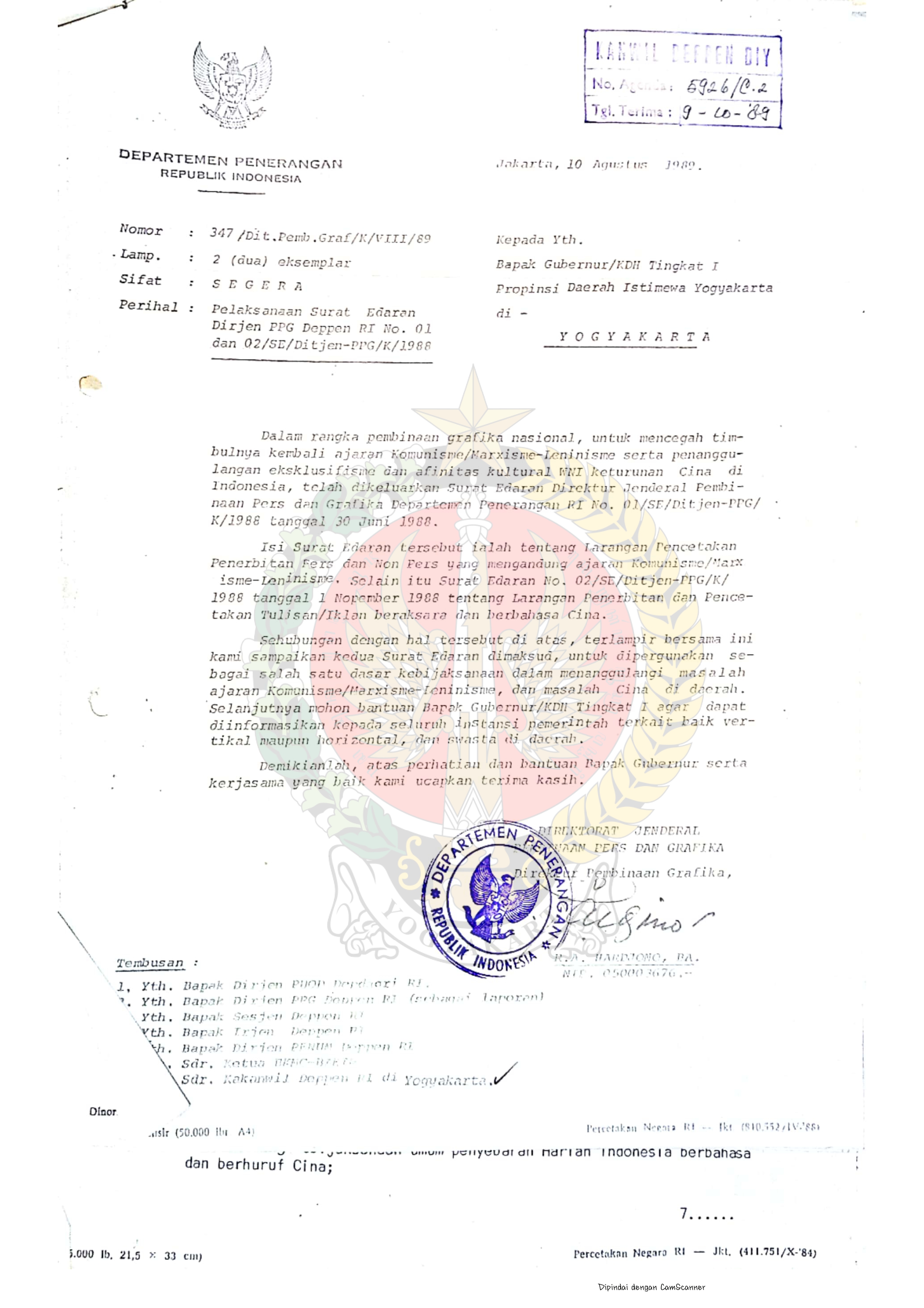 Berkas pelaksanaan Surat Edaran Direktorat Jenderal Pembinaan Pers dan Grafika Departemen Penerangan Republik Indonesia Nomor : 01 dan 02/SE/Ditjen-PPG/K/1988 isi surat edaran tersebut adalah larangan percetakan penerbitan pers dan non pers yang mengandung Komunisme/Marxisme-Leninisme, dan tulisan/iklan beraksara dan berbahasa Cina.