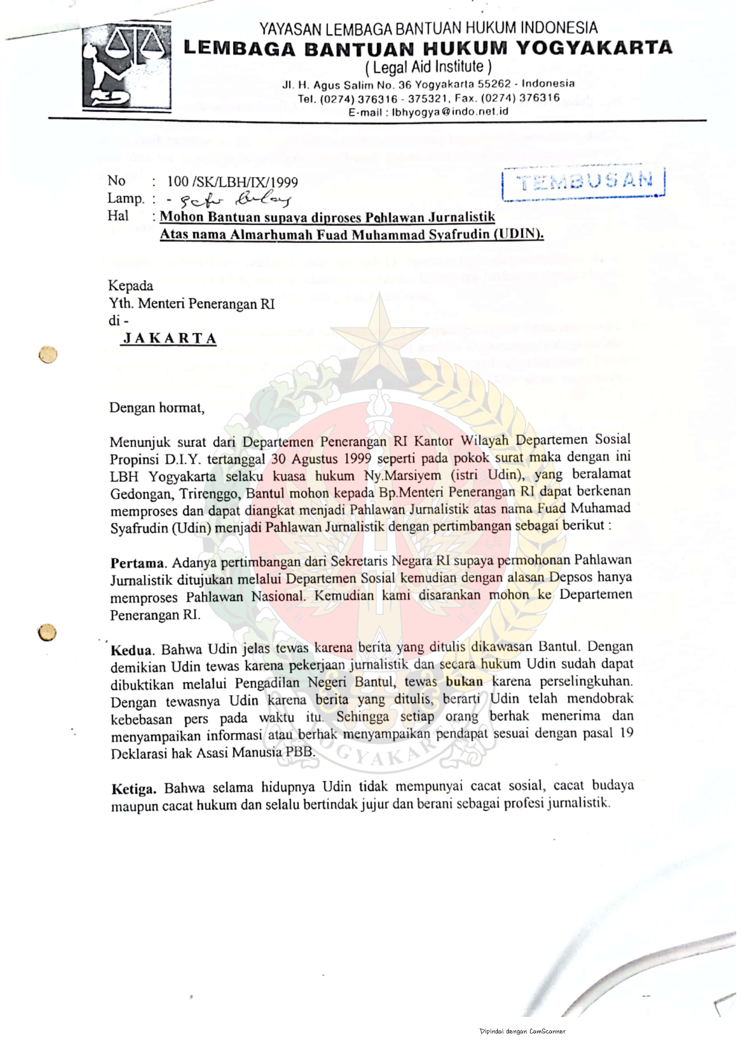 Surat dari Lembaga Bantuan Hukum Yogyakarta tentang permohonan bantuan supaya diproses sebagai Pahlawan Jurnalistik atas nama Almarhum Fuad Muhammad Syafrudin (Udin).