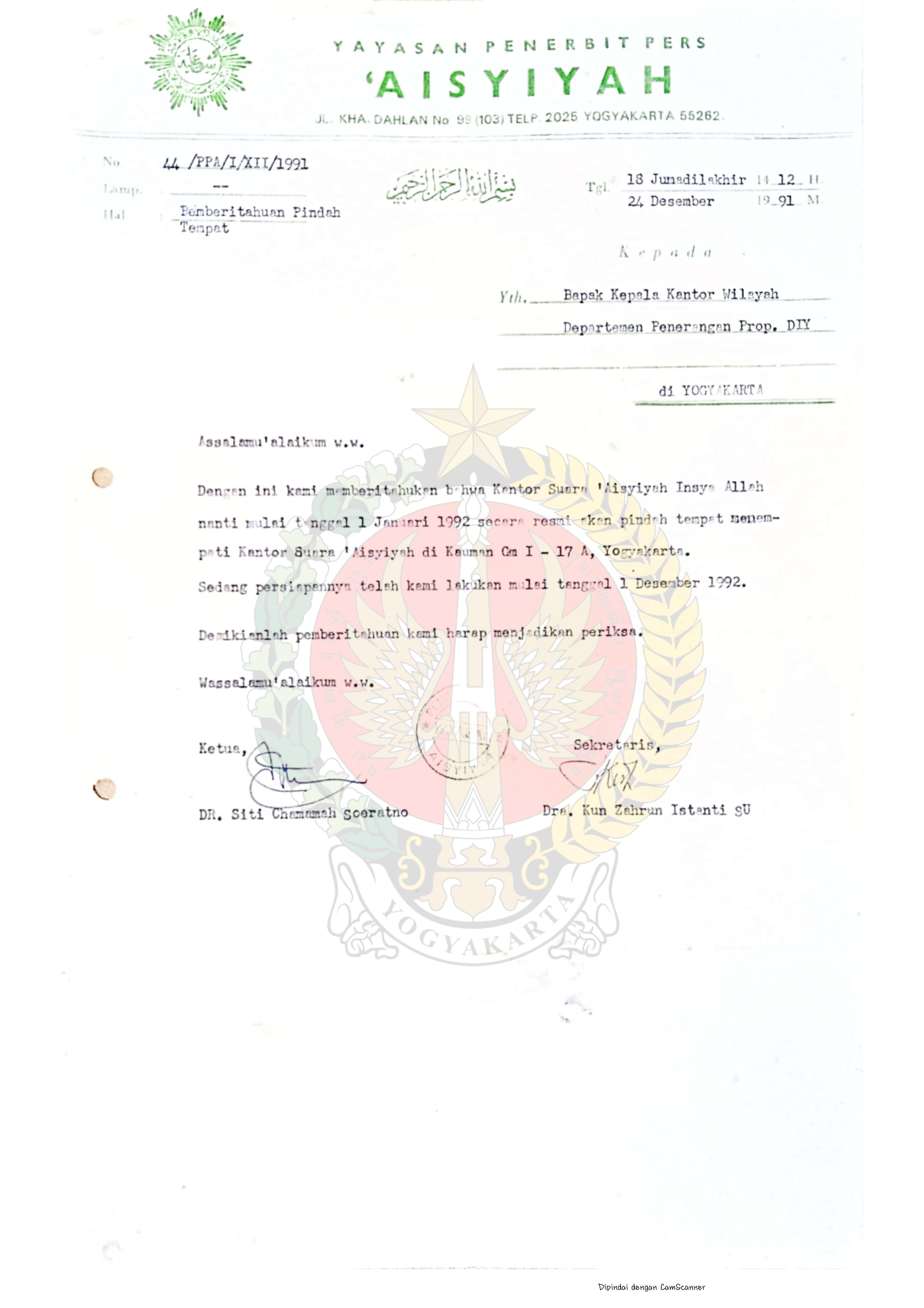 Surat dari Pengurus Yayasan Penerbit Pers Aisyiyah kepada Kepala Kantor Wilayah Penerangan Provinsi Daerah Istimewa Yogyakarta perihal pemberitahuan pindah alamat kantor.
