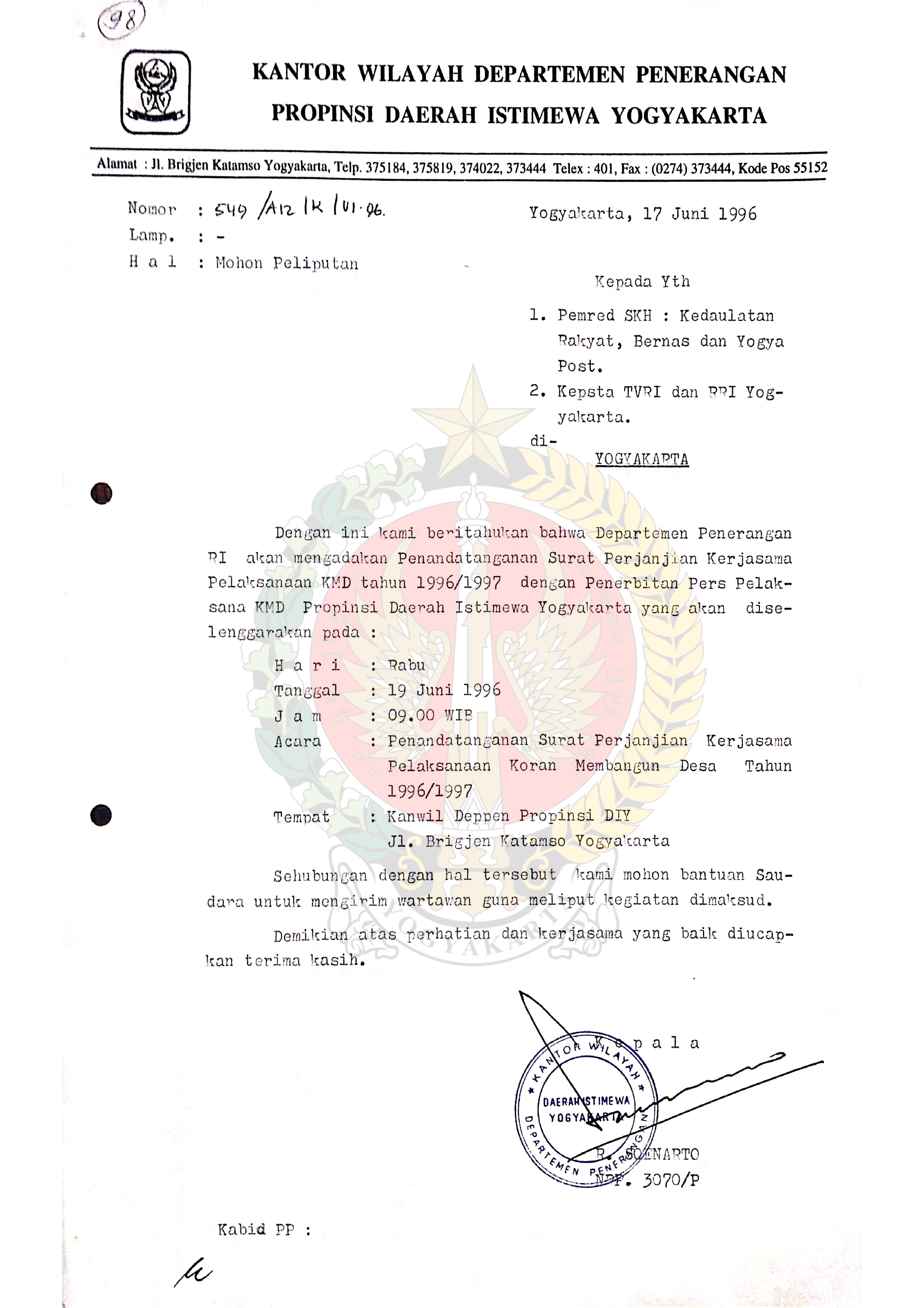 Surat dari Kepala Kantor Wilayah Departemen Penerangan Daerah Istimewa Yogyakarta kepada Pemimpin Redaksi Surat Kabar Harian Kedaulatan Rakyat, dkk perihal mohon bantuan peliputan kegiatan Departemen Penerangan Republik Indonesia dan Penerbitan Pers Pelaksana Koran Masuk Desa Provinsi Daerah Istimewa Yogyakarta perihal Kegiatan Penandatanganan Surat Perjanjian Kerjasama Pelaksanaan Koran Masuk Desa Tahun 1996/1997