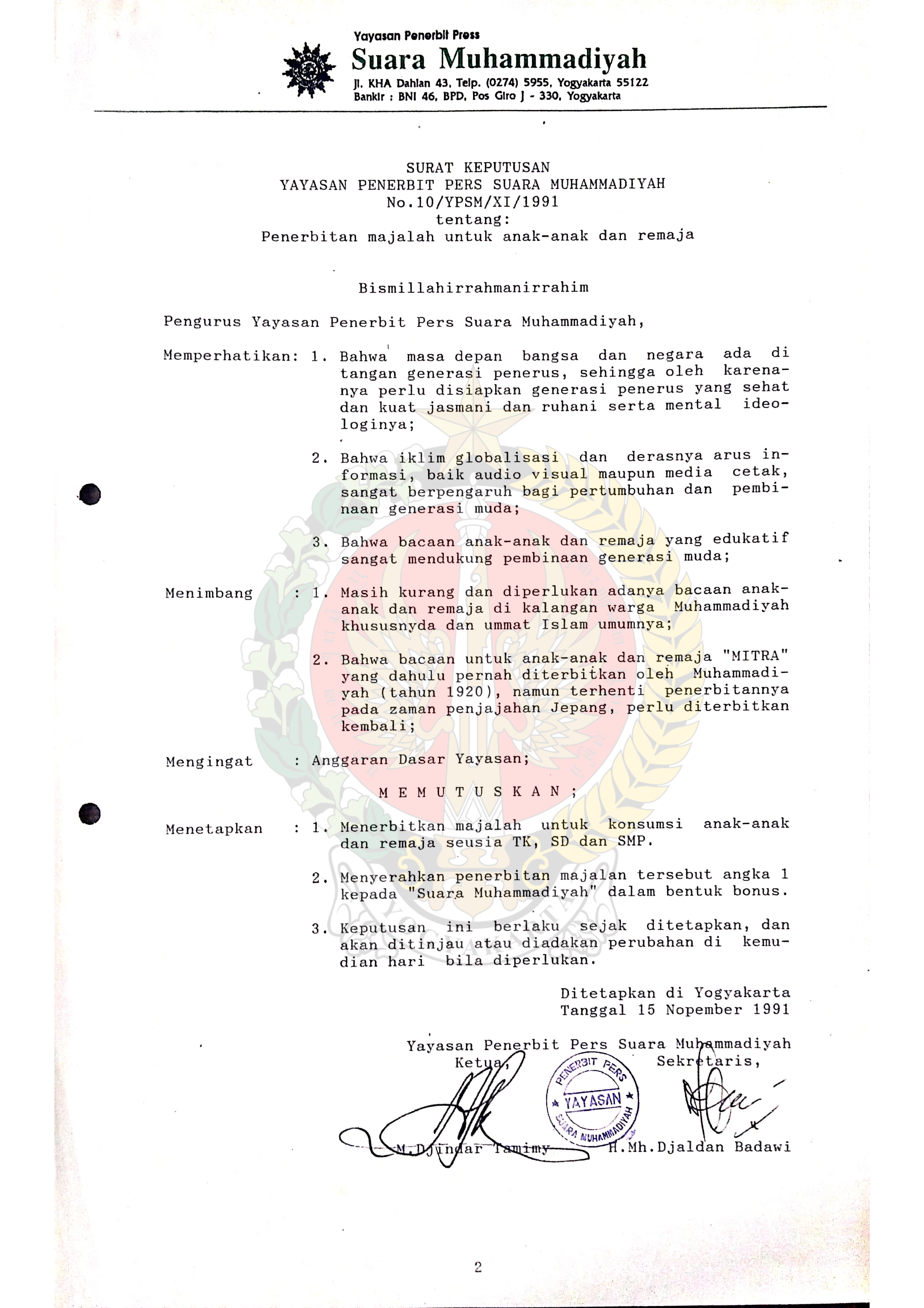 Surat Keputusan Yayasan Penerbit Pers Suara Muhammadiyah Nomor : 10/YPSM/XI/ 1991 tentang penerbitan majalah untuk anak-anak dan remaja.