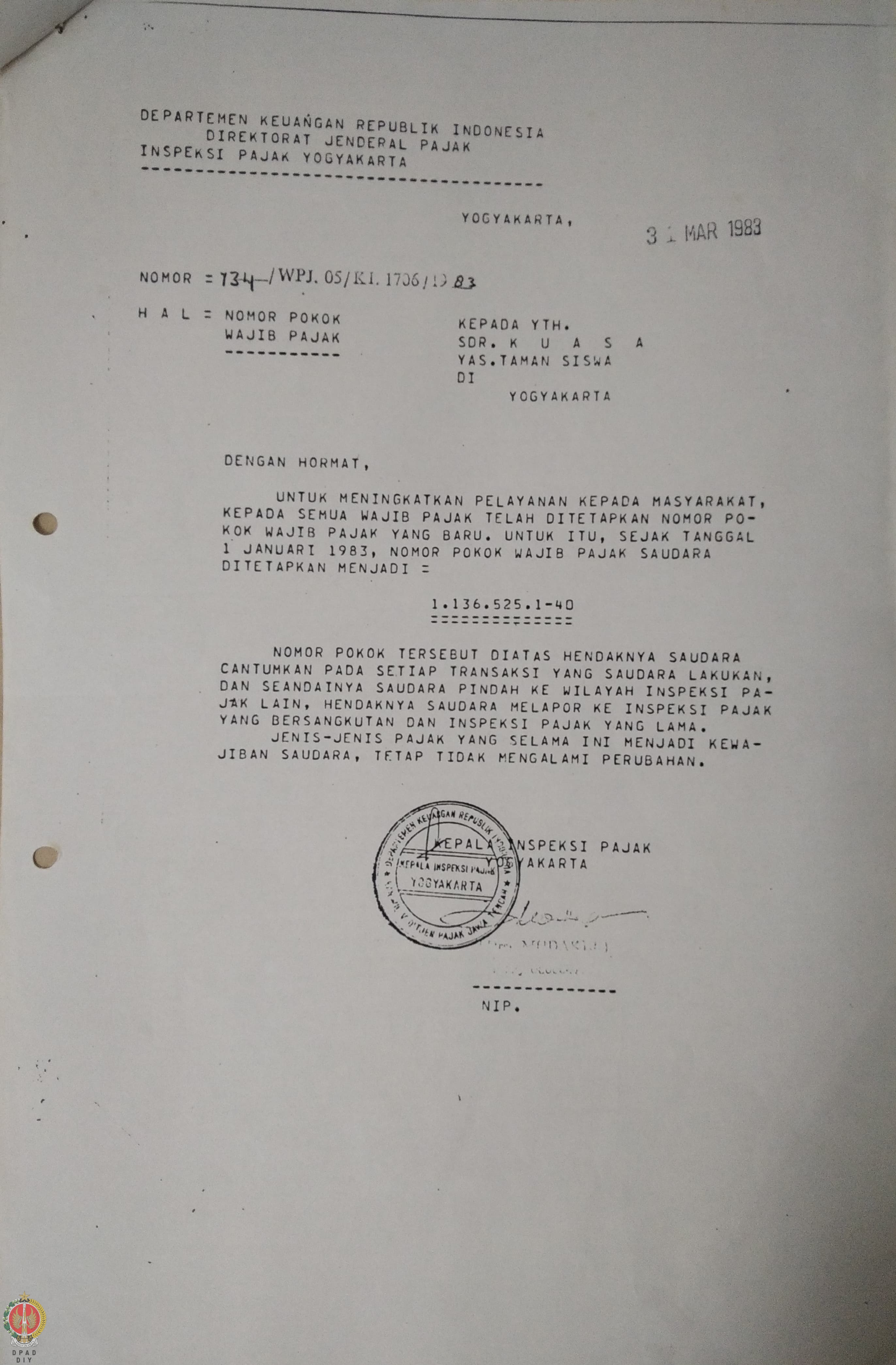 Surat dari Kepala Inspeksi Pajak Yogyakarta kepada Saudara Kuasa Yayasan Tamansiswa di Yogyakarta perihal mulai tanggal 1 Januari 1983 Nomor Pokok Wajib Pajak (NPWP) ditetapkan menjadi 1.136.525.1-40