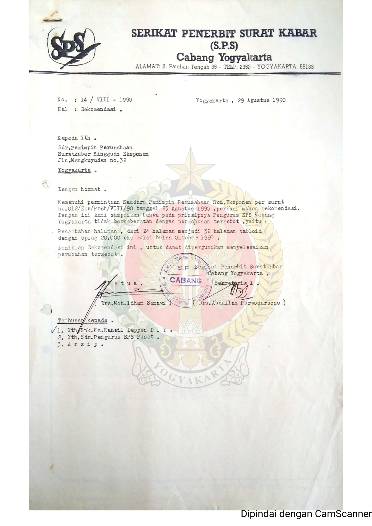 Surat dari Direktur Pembinaan Pers Departemen Penerangan Republik Indoesia kepada Pemimpin Umum Surat Kabar Harian Bernas Yogyakarta perihal pemberitahuan prosedur penambahan halaman Surat Kabar Harian Bernas.