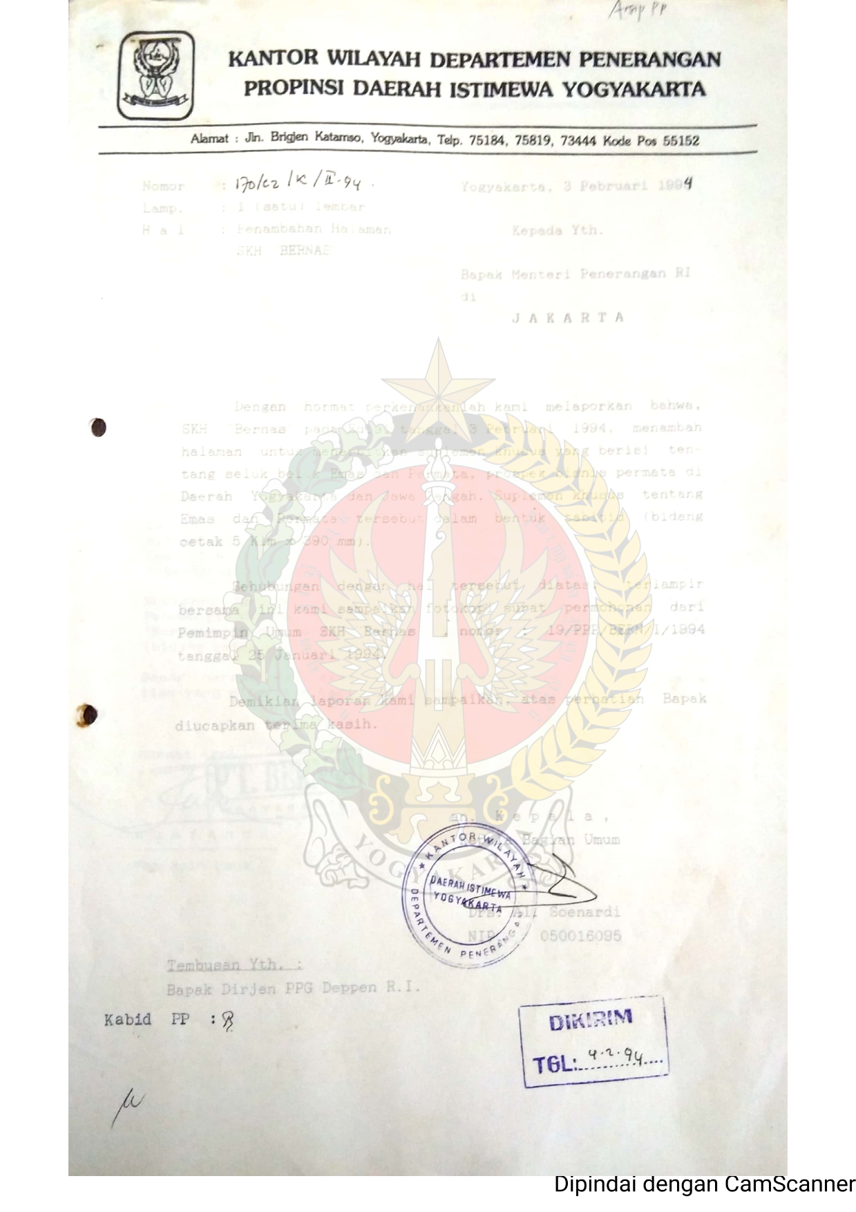 Surat dari Kepala Bagian Umum yang bertindak atas nama Kepala Kantor Wilayah Departemen Penerangan Provinsi Daerah Istimewa Yogyakarta kepada Menteri Penerangan Republik Indonesia perihal Laporan Penambahan Halaman Surat Kabar Harian โBernasโ yang berisi tentang Seluk Beluk Emas Dan Permata Prospek Bisnis Permata di Daerah Istimewa Yogyakarta dan Jawa Tengah, beserta lampirannya