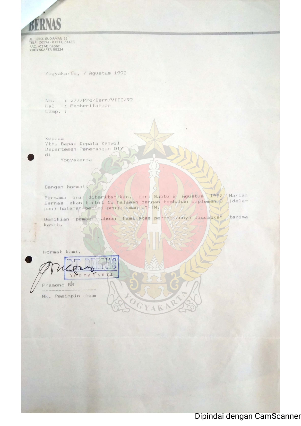 Surat dari Pemimpin Umum PT. Bernas kepada Kepala Kantor Wilayah Departemen Penerangan Daerah Istimewa Yogyakarta perihal pemberitahuan bahwa Sabtu, 8 Agustus 1992 Harian Bernas terbit 12 halaman dengan tambahan suplemen 8 halaman berisi pengumuman UMPTN (Ujian Masuk Perguruan Tinggi Negeri).
