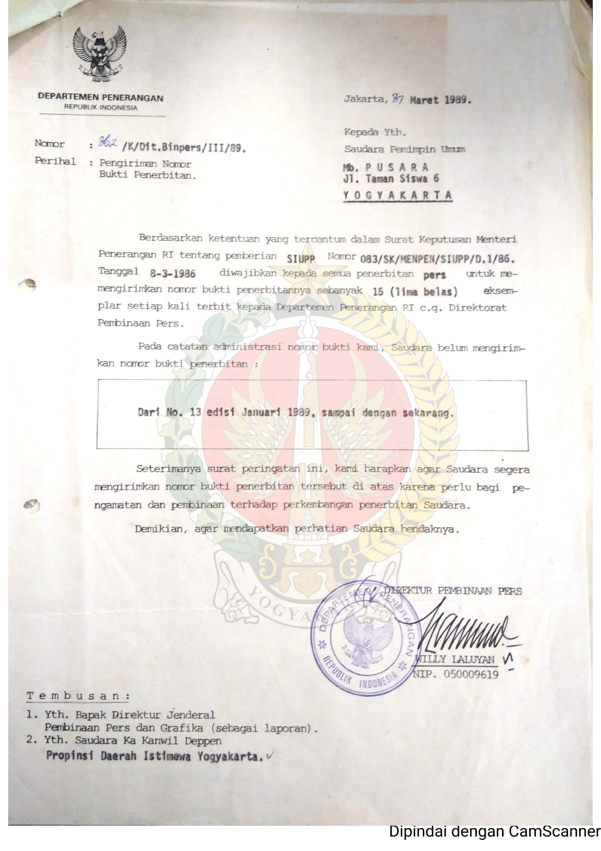 Surat dari Direktur Pembinaan Pers Departemen Penerangan Republik Indonesia kepada Pemimpin Umum Majalah Tengah Bulanan Putera Kita Yogyakarta perihal permintaan penjelasan mengenai belum diterimanya Nomor Bukti Terbit sampai bulan Juni 1996