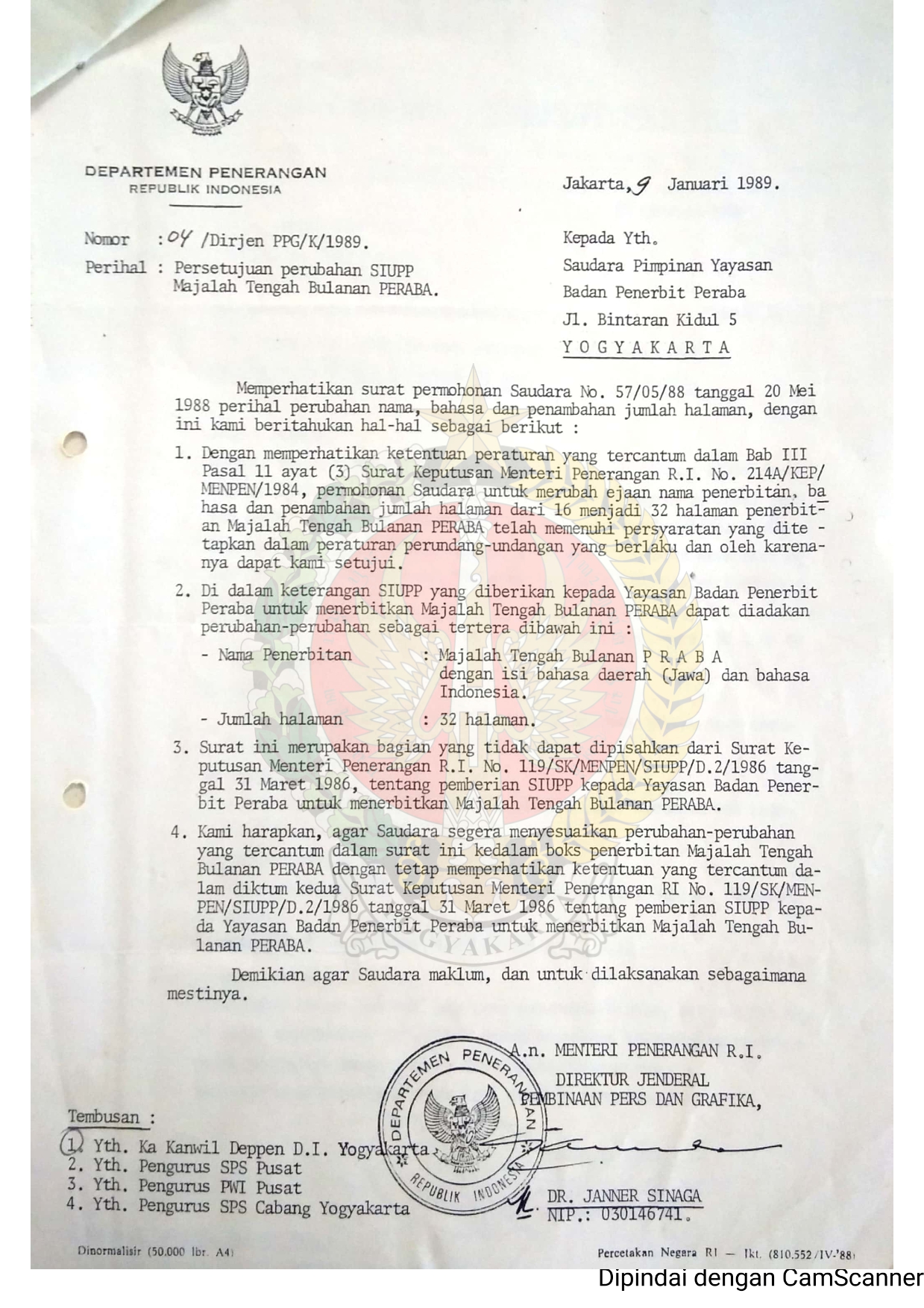 Berkas Persetujuan Perubahan SIUPP (Surat Izin Usaha Penerbitan Pers) Majalah Tengah Bulanan Peraba dengan perubahan yang baru yaitu Nama Penerbitan Majalah Tengah Bulanan Praba denga isi Bahasa Jawa dan Bahasa Indonesia., Jumlah halaman: 32 halaman