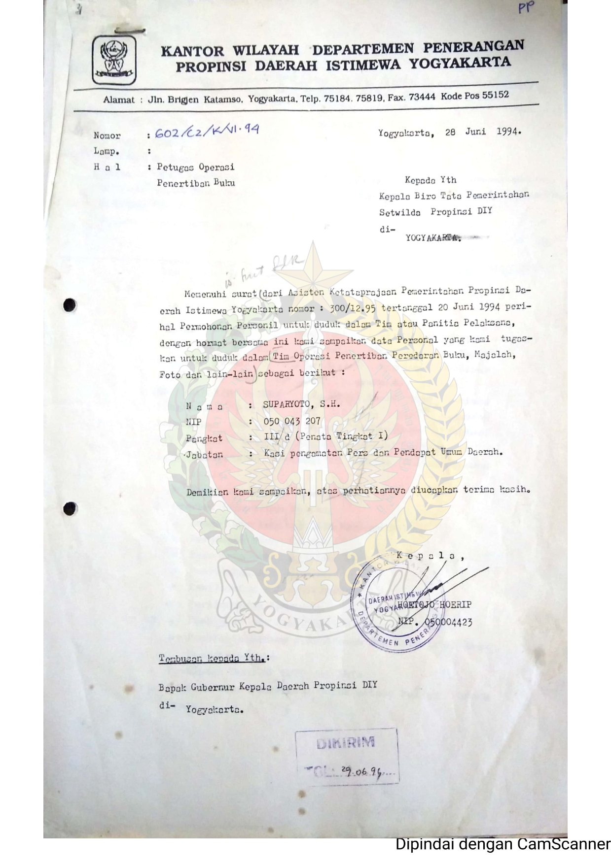 Berkas permohonan dan pengiriman personil dalam tim operasi penerbitan dan peredaran buku, majalah, foto dan lain-lain atas nama Suparyoto, SH.