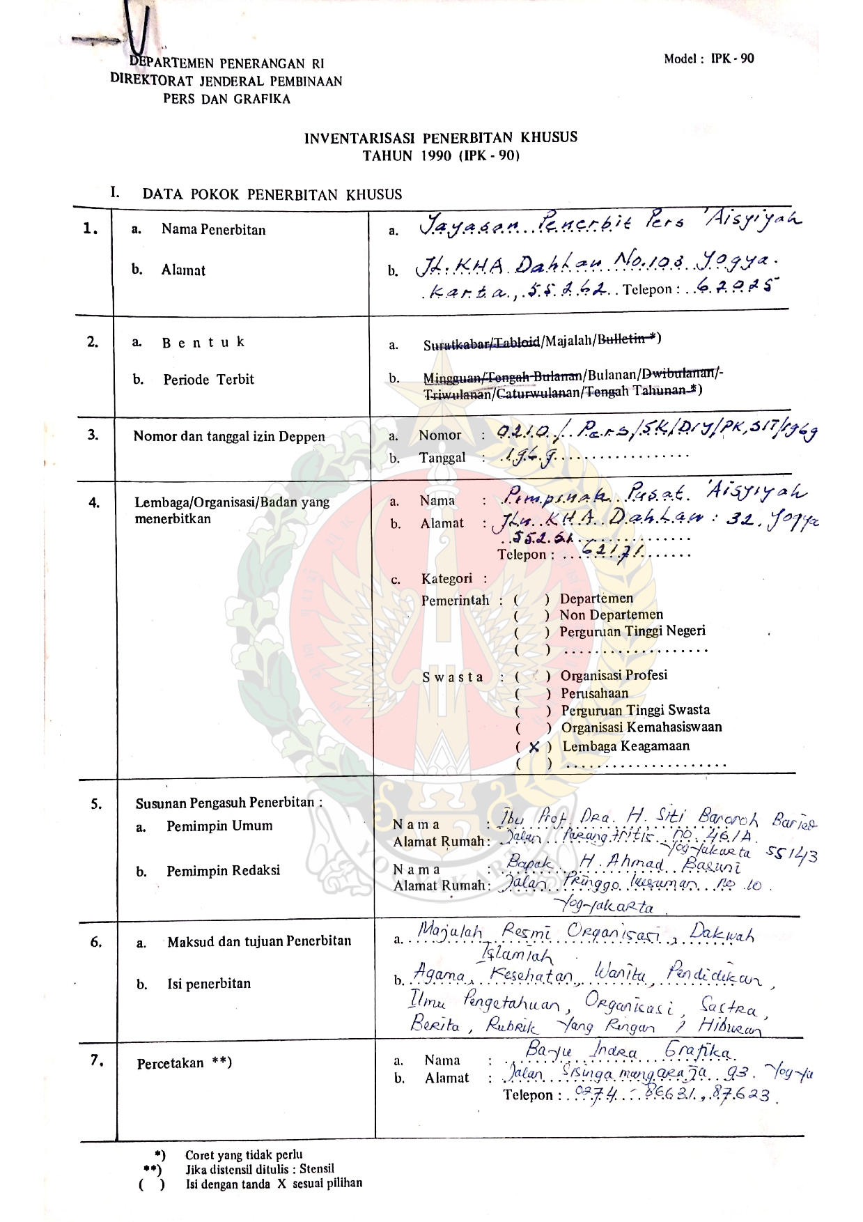 Data Inventarisasi Penerbitan Khusus tahun 1990 (IPK-90) oleh Yayasan Penerbitan Pers Aisyiyah.