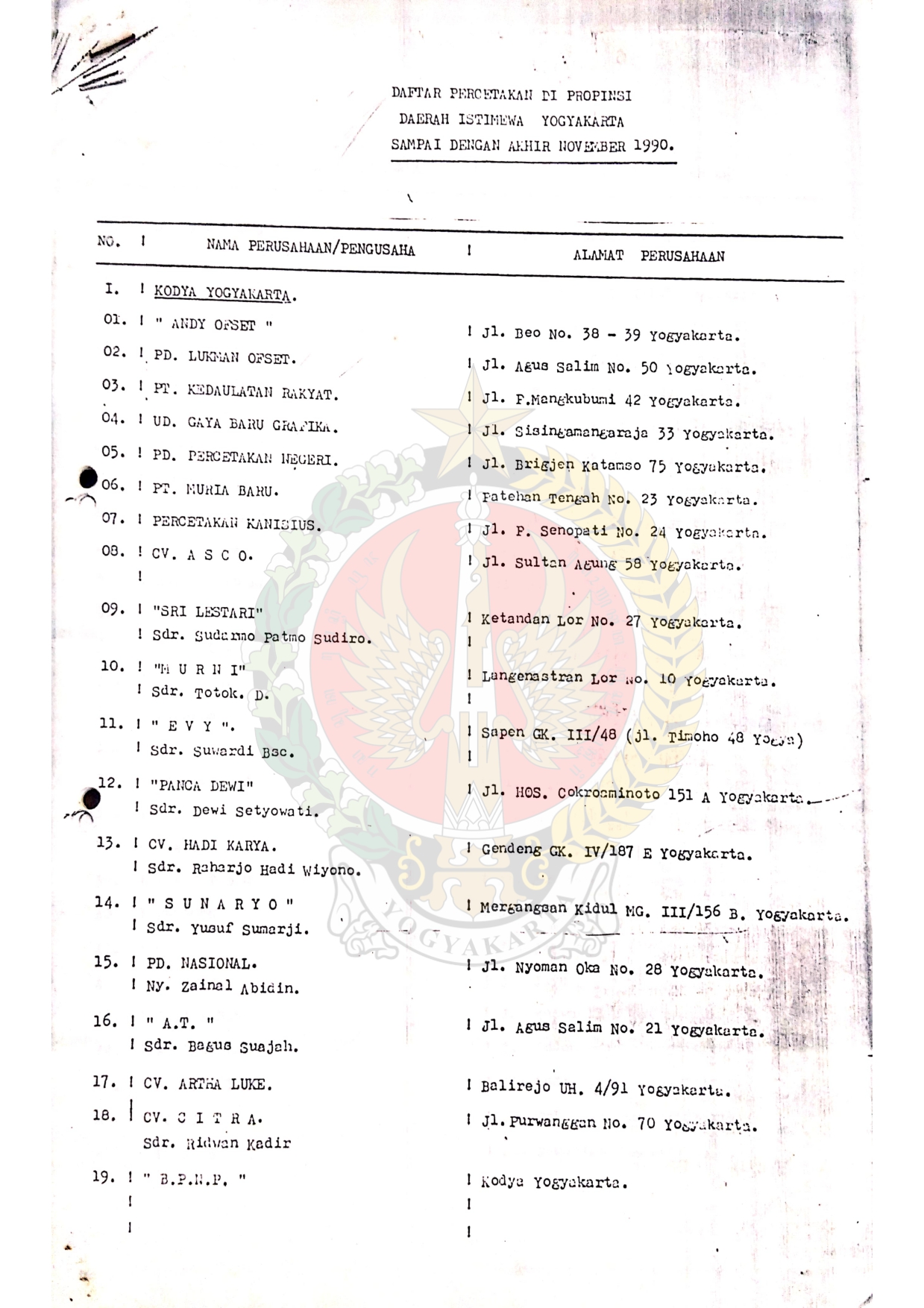 Daftar Percetakan di Provinsi Daerah Istimewa Yogyakarta sampai dengan November 1990 dari Departemen Perindustrian Kantor Wilayah Provinsi Daerah Istimewa Yogyakarta.