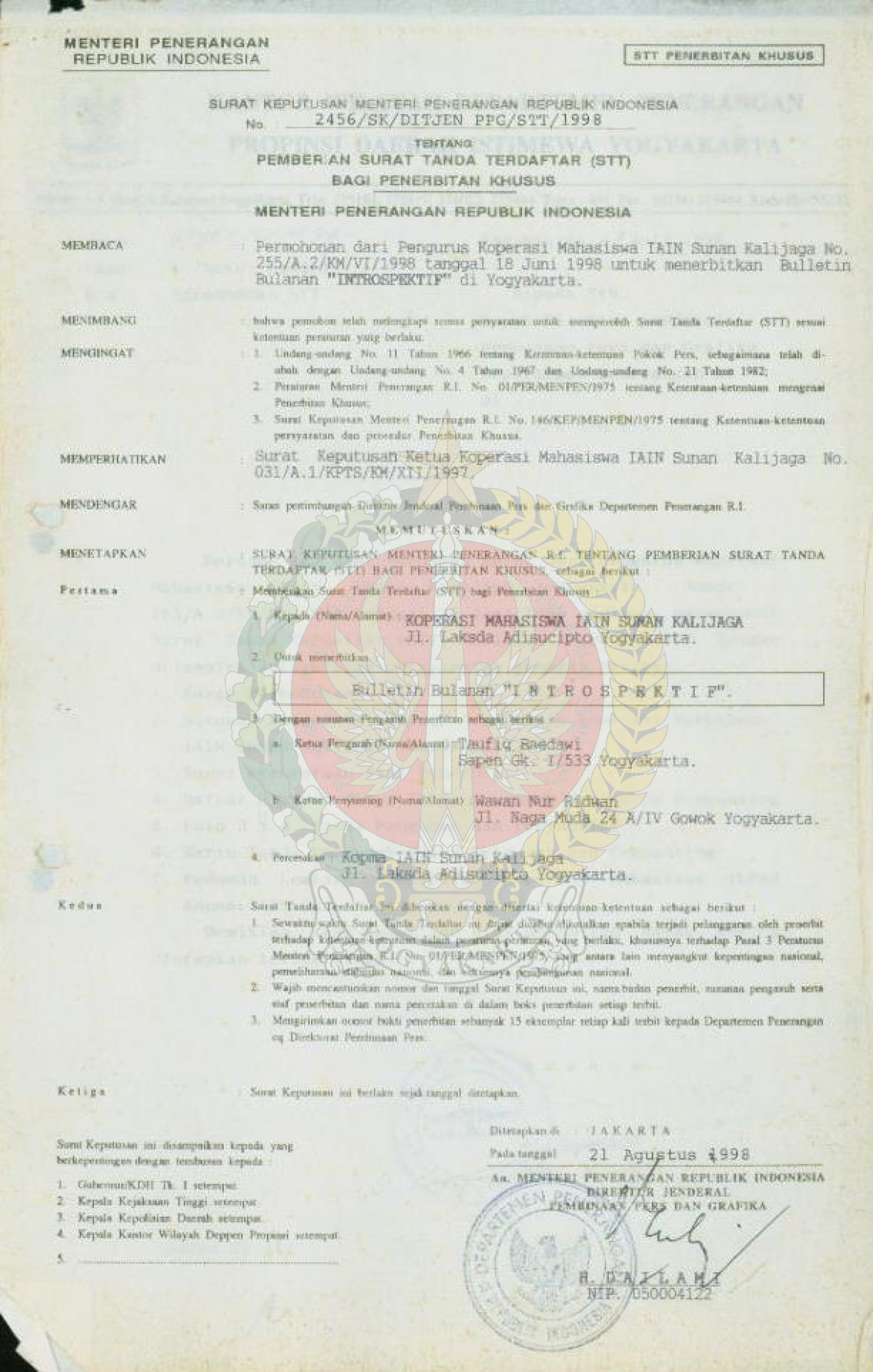 Berkas Surat Keputusan Menteri Penerangan Republik Indonesia Nomor : 2456/SK/ DITJEN PPG/STT/1998 tentang pemberian Surat Tanda Terdaftar (STT) bagi penerbitan khusus kepada Koperasi Mahasiswa IAIN Sunan Kalijaga untuk menerbitkan Bulletin Bulanan โIntrospektifโ.
