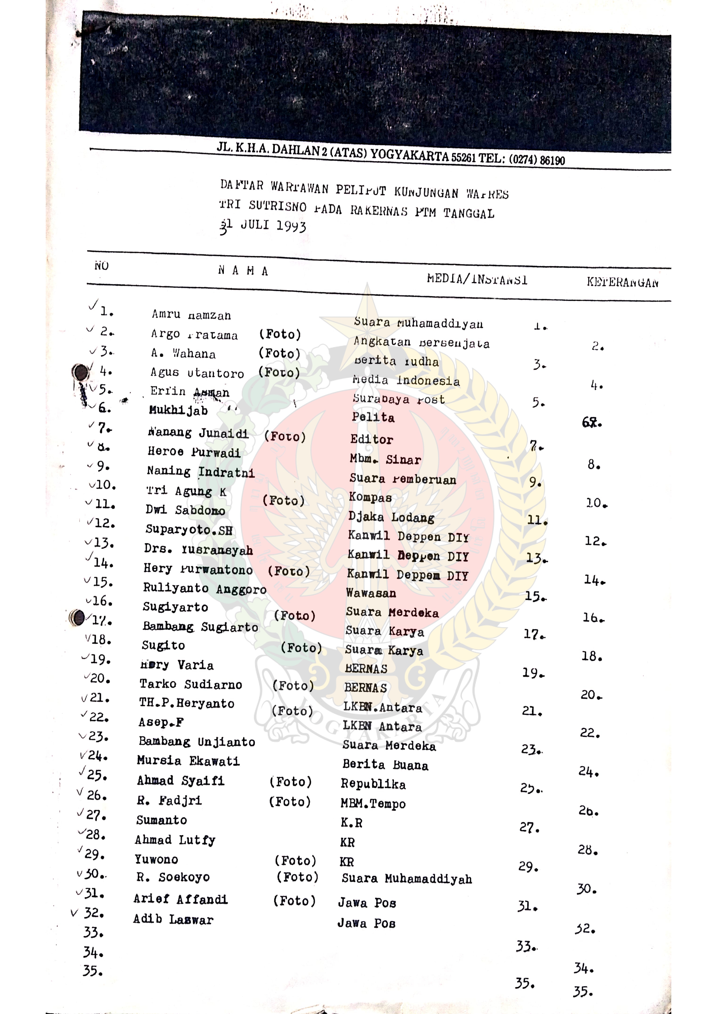 Daftar Wartawan Peliput Kunjungan Wakil Presiden Tri Sutrisno pada Rapat Kerja Nasional PTM tanggal 31 Juli 1993