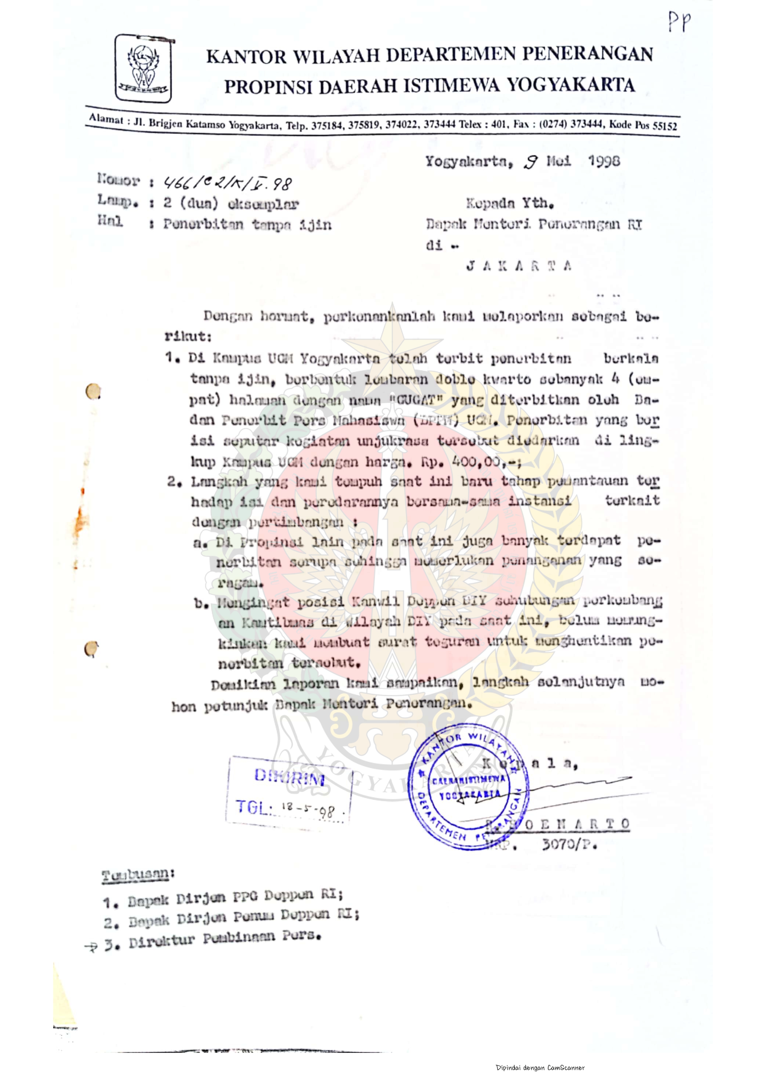 Surat dari Kepala Kantor Wilayah Departemen Penerangan Provinsi Daerah Istimewa Yogyakarta kepada Menteri Penerangan Republik Indonesia mengenai penerbitan tanpa izin lembaran doble kwarto sebanyak 4 halaman dengan nama โGUGATโ yang diterbitkan oleh Badan Penerbitan Pers Mahasiswa Universitas Gadjah Mada beserta lampiranya.