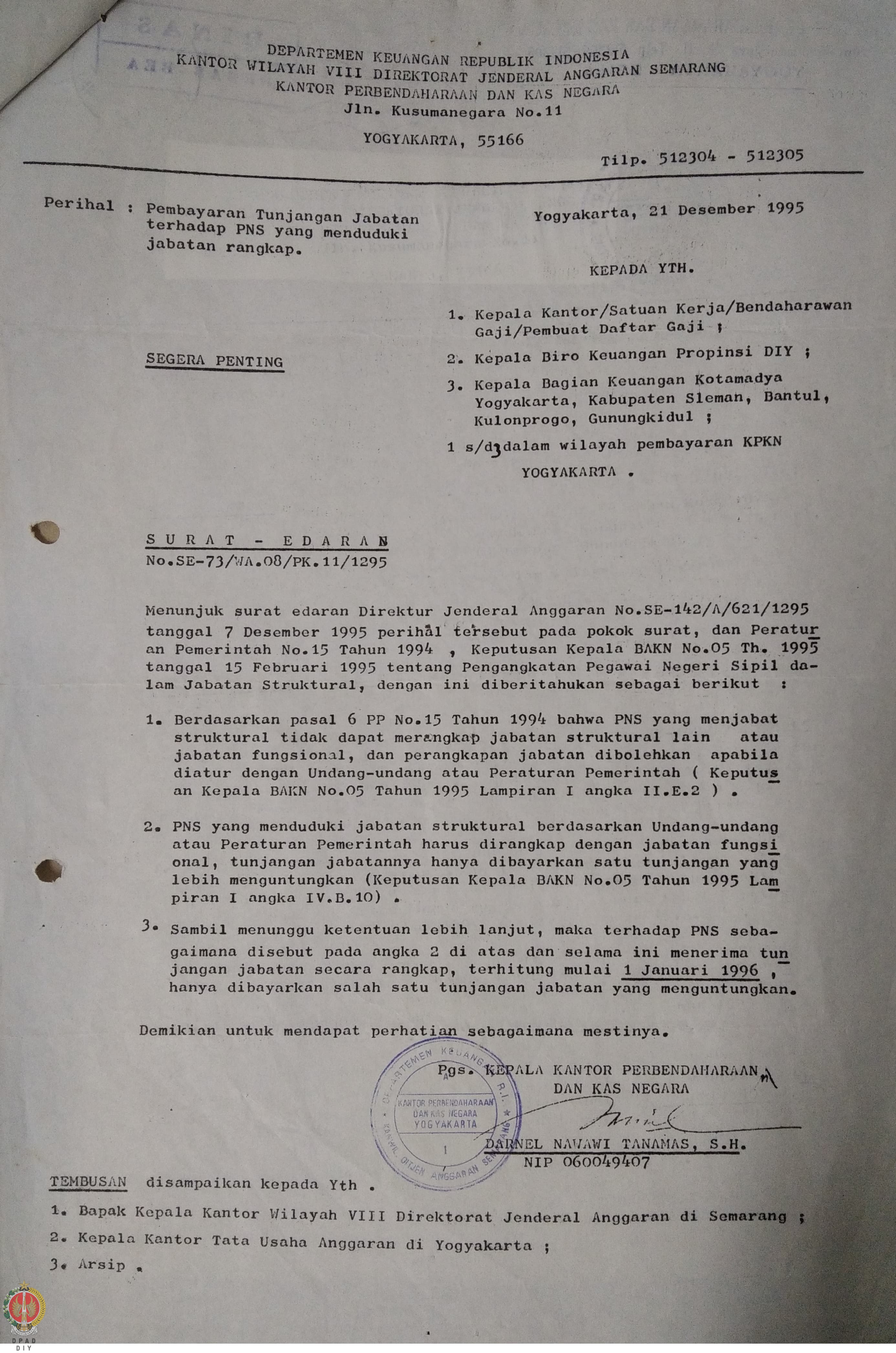 Surat Edaran dari Kantor Perbendaharaan dan Kas Negara Yogyakarta perihal pembayaran tunjangan jabatan terhadap Pegawai Negeri Sipil (PNS) yang menduduki jabatan rangkap