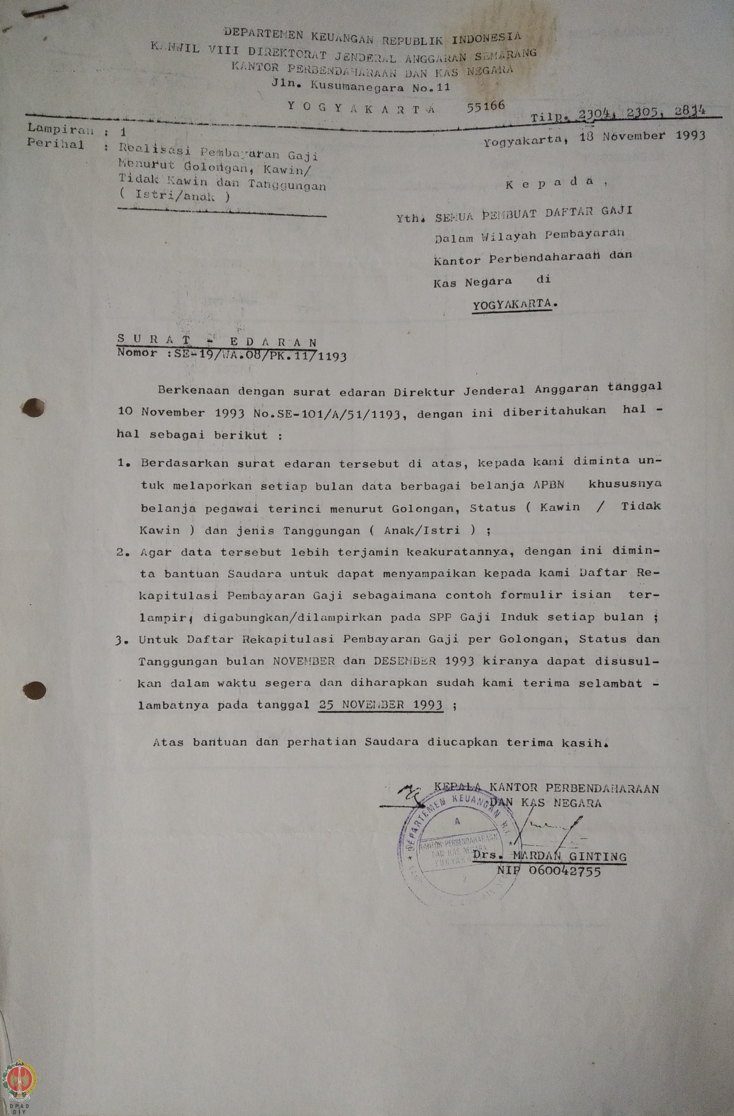 Surat Edaran dari Kantor Perbendaharan dan Kas Negara (KPKN) Yogyakarta perihal realisasi pembayaran gaji menurut golongan, kawin/tidak kawin dan tanggungan (istri/anak).