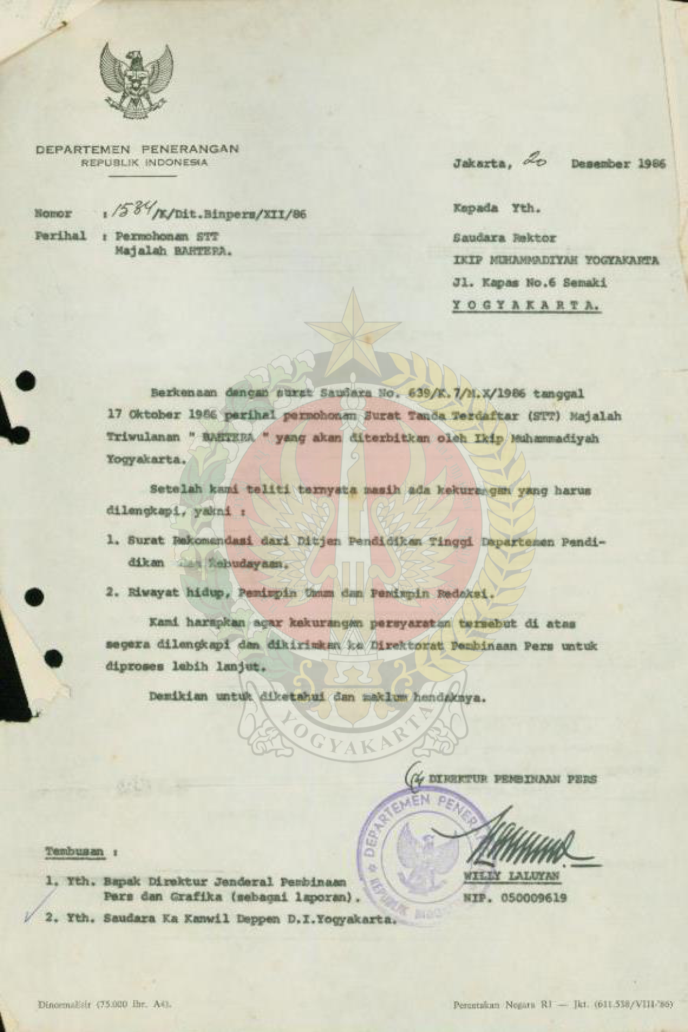 Surat dari Direktur Pembinaan Pers Departemen Penerangan Republik Indonesia kepada Rektor IKIP Muhammadiyah Yogyakarta megenai masih adanya kekurangan yang harus dilengkapi perihal Surat Tanda Terdaftar (STT) Majalah Triwulanan “BAHTERA”.