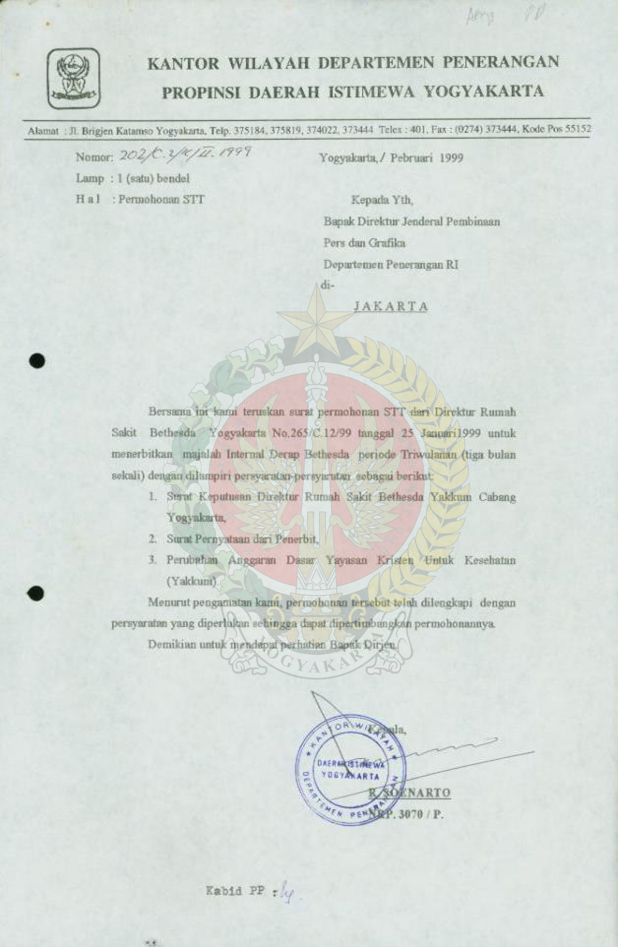 Berkas permohonan Surat Tanda Terdaftar (STT) Majalah Internal Derap Bethesda.