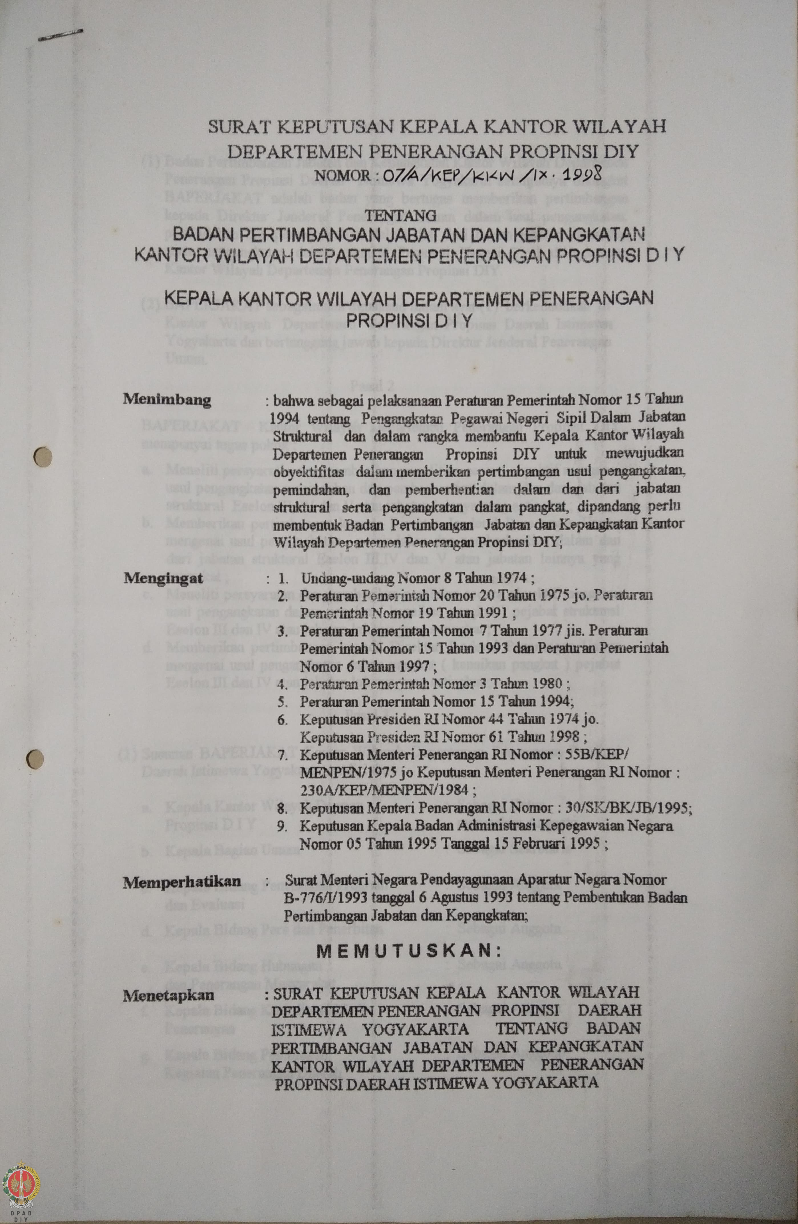 Surat Keputusan Kepala Kantor Wilayah Departemen Penerangan Daerah Istimewa Yogyakarta Nomor : 07/A/KEP/KKW/IX.1998 tentang Badan Pertimbangan Jabatan dan Kepangkatan Kantor Wilayah Departemen Penerangan Provinsi Daerah Istimewa Yogyakarta.