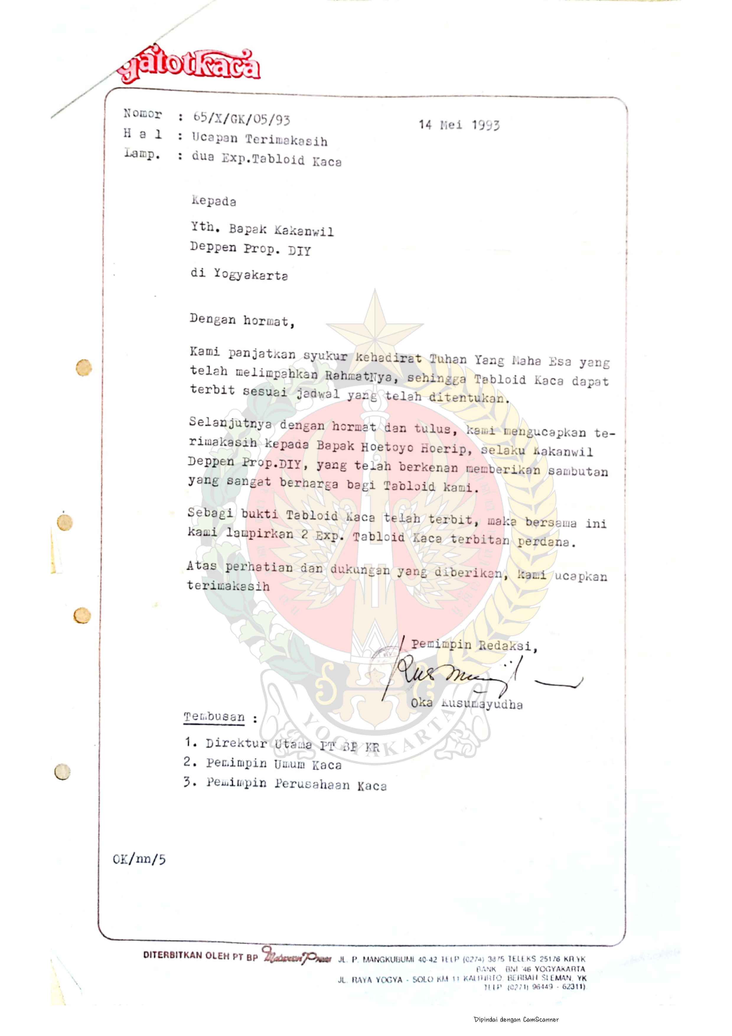 DPAD.ORBA.T26.F.1.38.1428 Surat dari Pemimpin Redaksi Gatotkaca kepada Bapak Kepala Kantor Wilayah Departemen Penerangan Provinsi Daerah Istimewa Yogyakarta perihal ucapan terimakasih kepada Bapak Hoetoyo Hoerip selaku Kepala Kantor Wilayah Departemen Penerangan Daerah Istimewa Yogyakarta telah berkenan memberikan sambutan dan Tabloid Gatotkaca terbit sesuai jadwal yang telah ditentukan. Item 14 mei Lihat